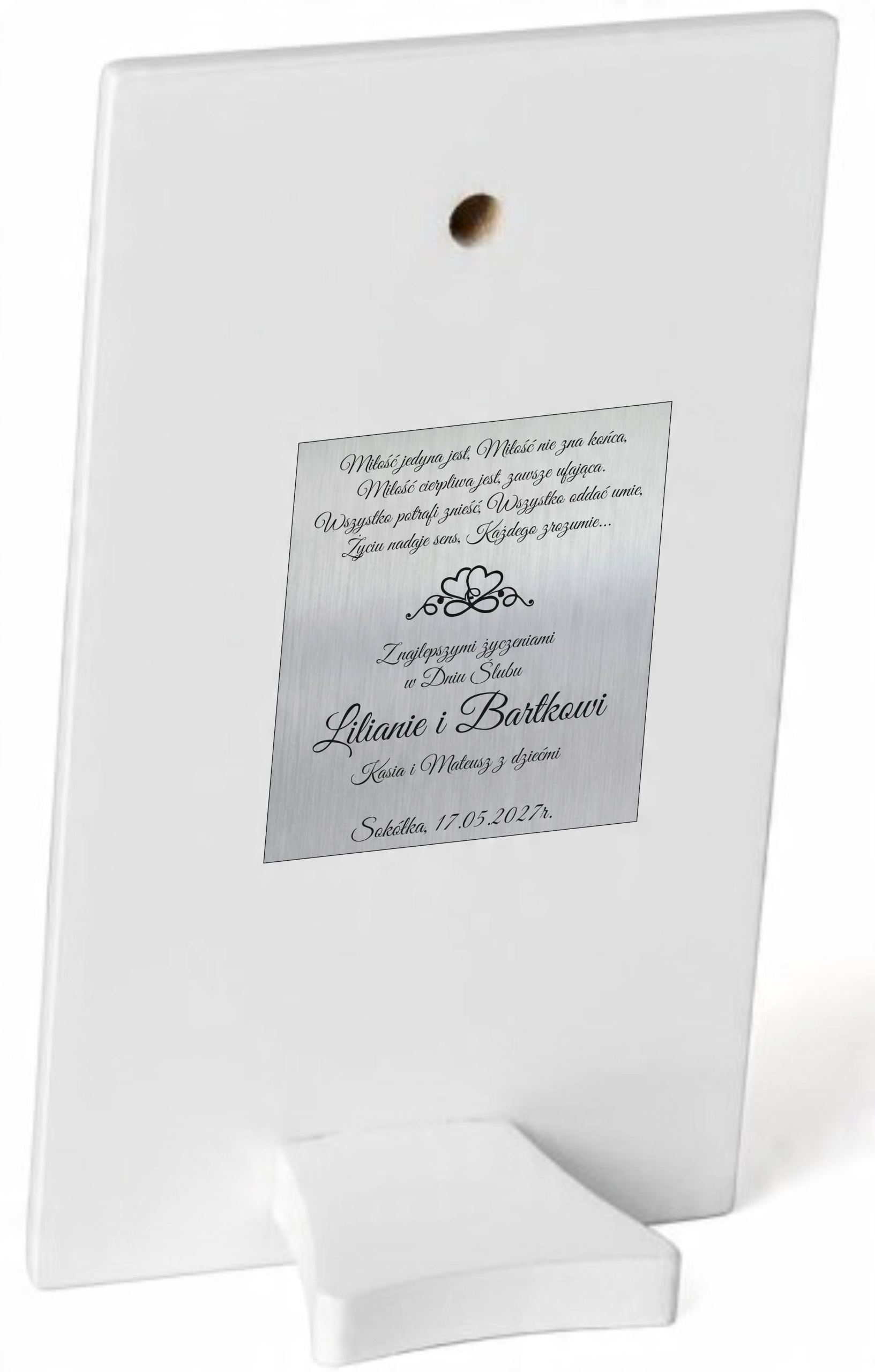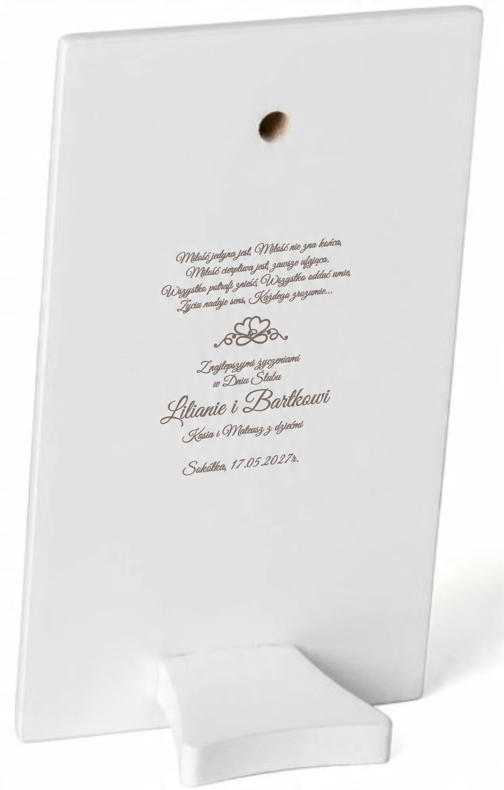 Присвята остаточно вигравірувана на срібній ламінованій пластині. За запитом ми можемо вигравірувати її на золотому ламінаті або прямо на деревину. Особливо рекомендуємо обрати гравіювання на дереві через його благородний та оригінальний зовнішній вигляд.