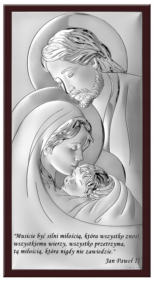 Срібна картина на коричневому дереві Святого Сімейства з цитатою Івана Павла ІІ «Треба бути сильними любов'ю...»