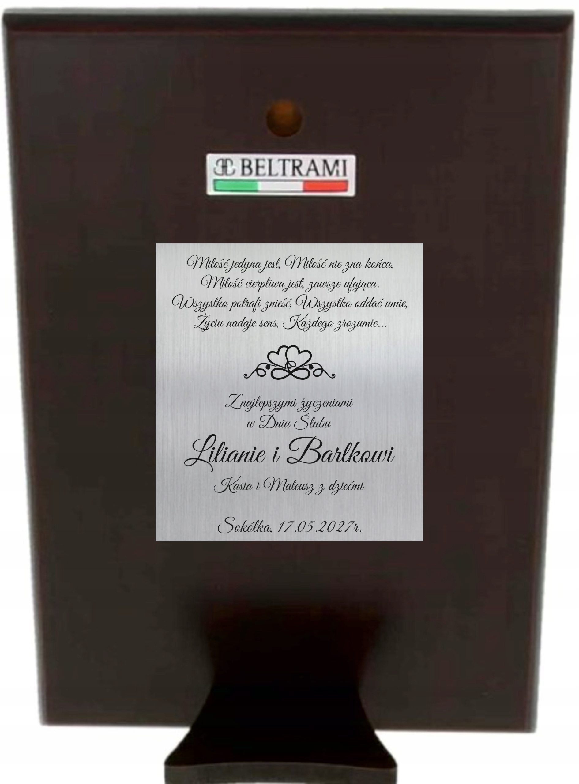 Присвята остаточно вигравірувана на срібній ламінатній пластині. За запитом ми можемо вигравірувати її на золотому ламінаті або прямо на деревину. Особливо рекомендуємо обрати гравіювання на дереві через його благородний та оригінальний зовнішній вигляд.