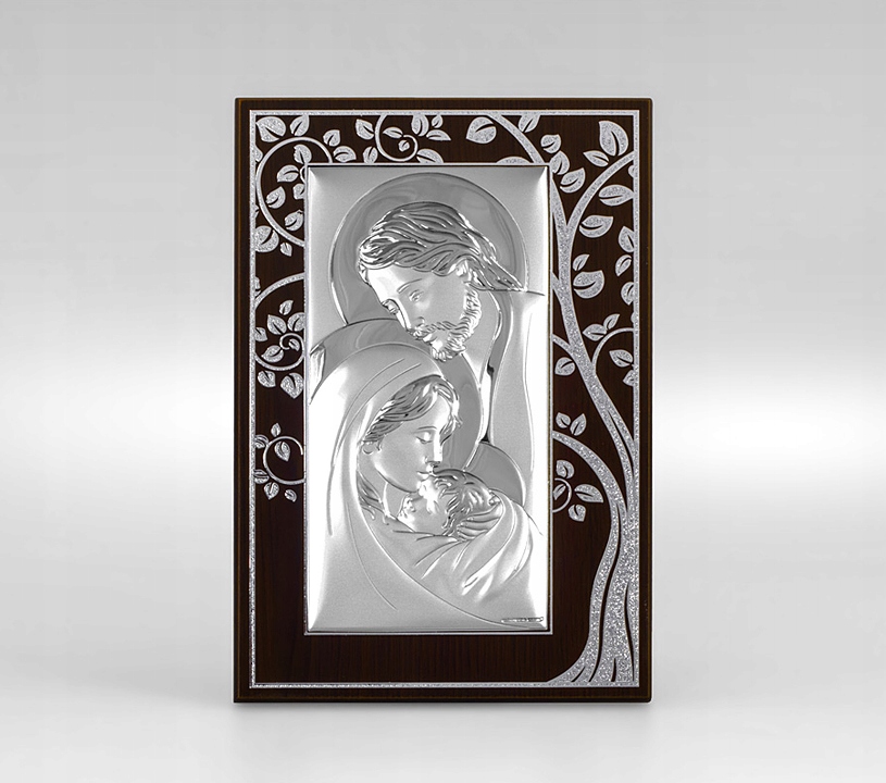 Елегантне срібло гравірована картина із зображенням Пресвятої родини з Немовлям, розміщена на темному дереві з мотивом дерева. Ідеальний весільний сувенір від батьків для нареченого і нареченої або до річниці таїнства шлюбу для близьких, а також для багатьох інших випадків, таких як Хрещення, Причастя чи Миропомазання.