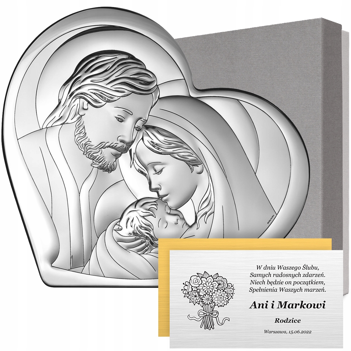 Срібна весільна картина Святого Сімейства з гравіюванням безкоштовно