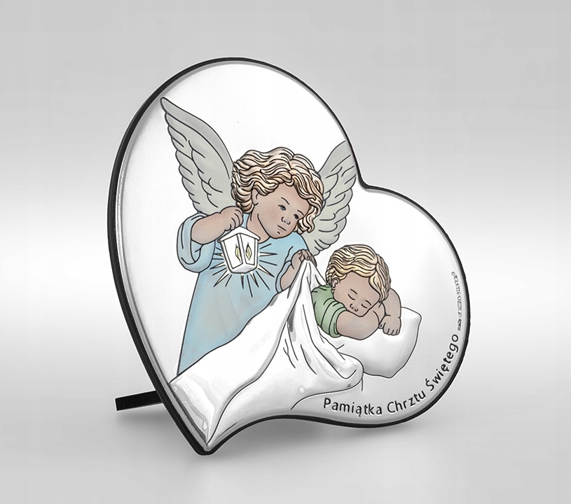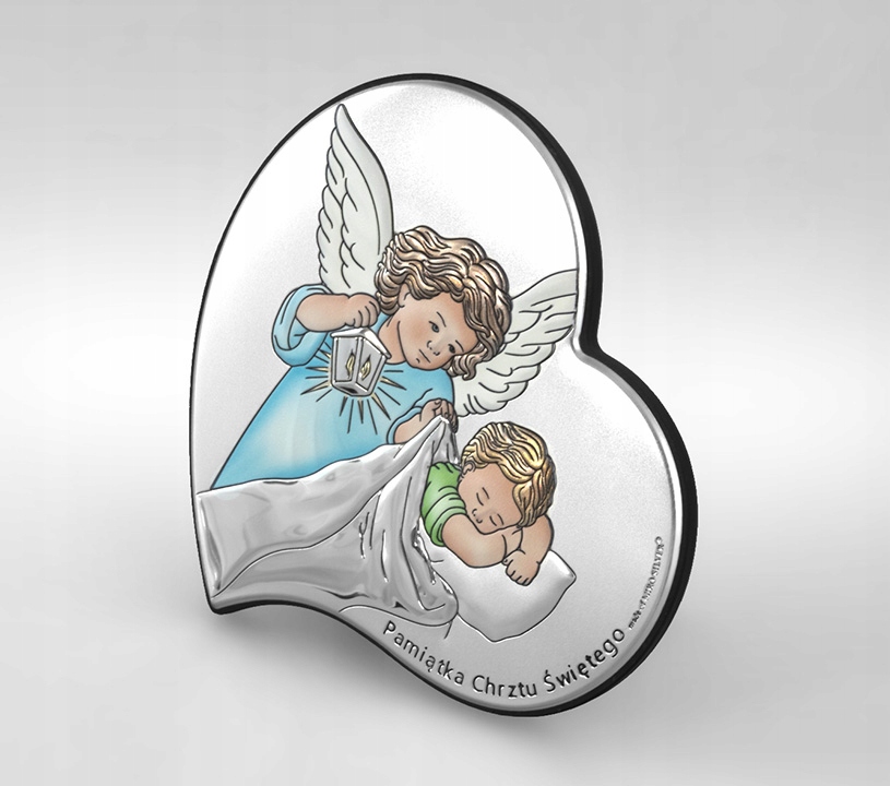 Срібна картина на Хрещення, кольорова, із зображенням ангела з ліхтариком, що схилився над сплячою дитиною, з написом «Сувенір Святого Хрещення». p>