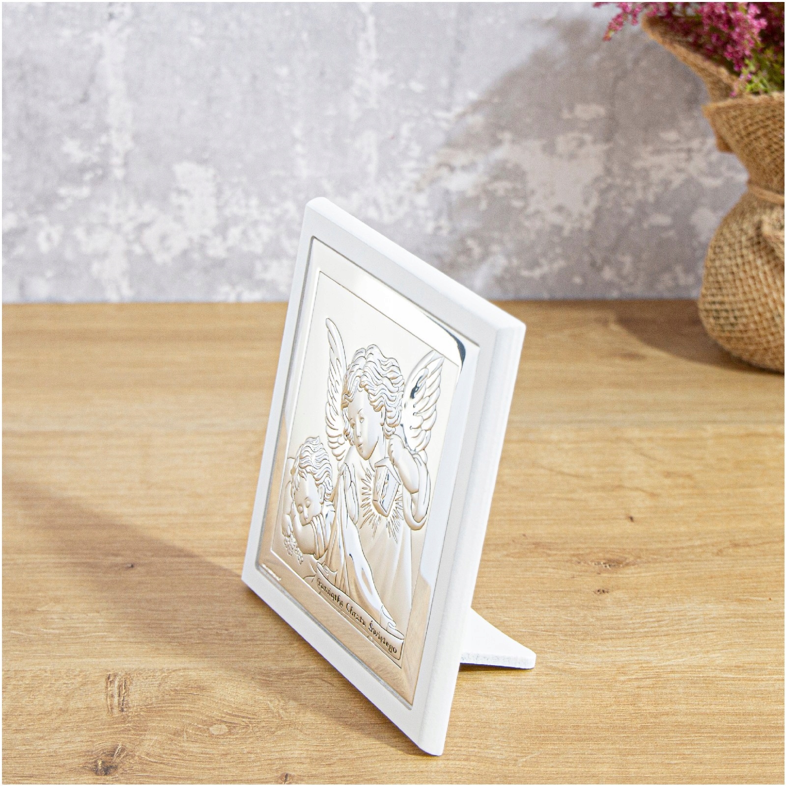 Картина із зображенням Ангела-охоронця з ліхтариком у білій рамці - чудовий подарунок на Хрещення. Висока якість виготовлення, вишукана обробка, елегантна упаковка – все це створює унікальний сувенір на довгі роки... Картина також надзвичайно практична: вона має вставну підставку, тому ми можемо поставити її на шафу чи комод або повісити на стіні.