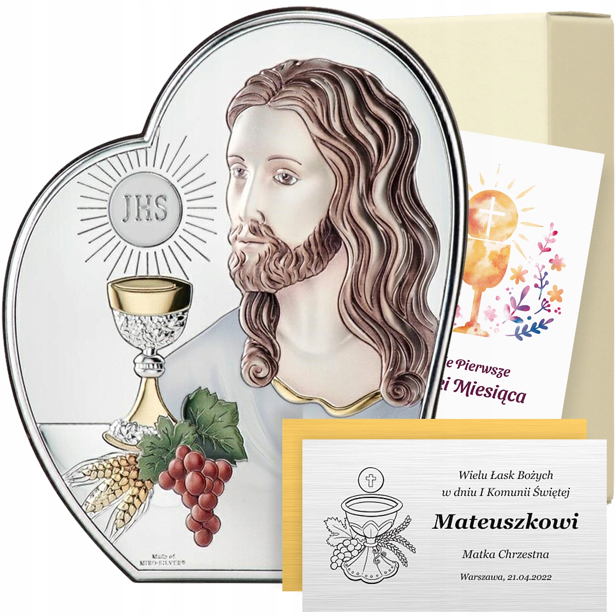 Срібна картинка для Першого Причастя в серці із зображенням Ісуса. Ідеальний подарунок для Першого Святого Причастя дитини.