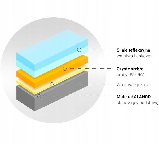 , в якому базовий шар alanod був покритий чистим сріблом в атомних процесах. Завдяки частковій пісковиках було досягнуто дивовижного ефекту поєднання блискучих та атласних поверхонь, які були захищені спеціальним захисним шаром з високим відбиваючим, захищаючи від окислення.