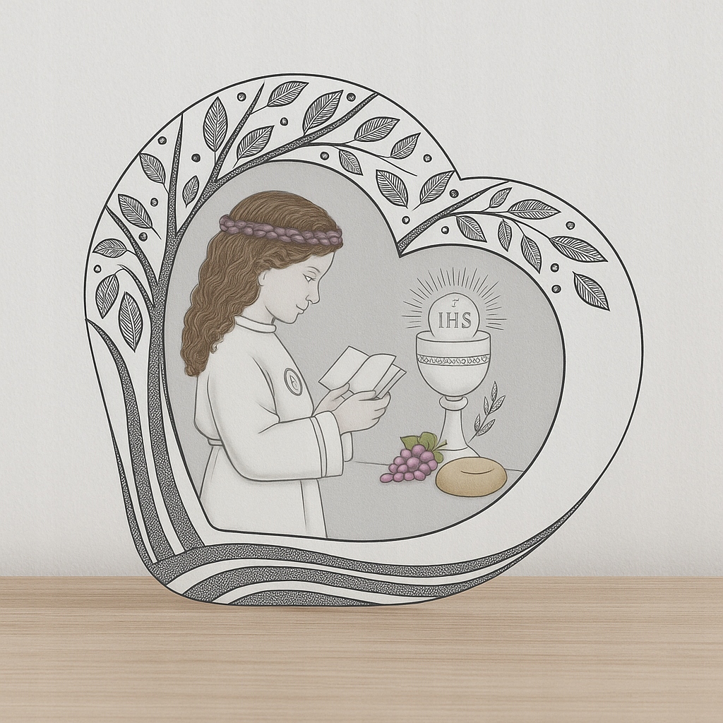 Сучасна та художня картина причастя у формі серця показує дівчину в альбі, яка тримає молитовник, з чашею та гостією IHS на задньому плані. Оточене символами Євхаристії – виноградом, хлібом і колосками – це посріблене зображення поєднує традиційну символіку та сучасну форму. Він поміщений в унікальну білу рамку з декоративним, рослинним візерунком, який нагадує стилізоване дерево життя, підкреслюючи духовний сенс події.