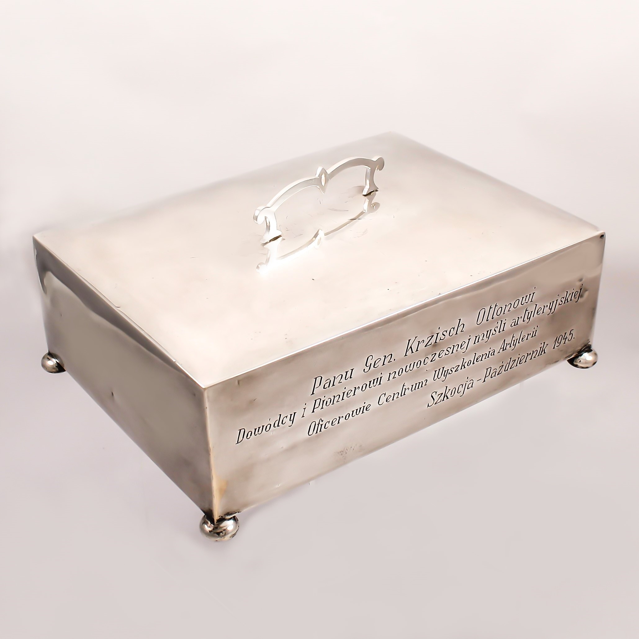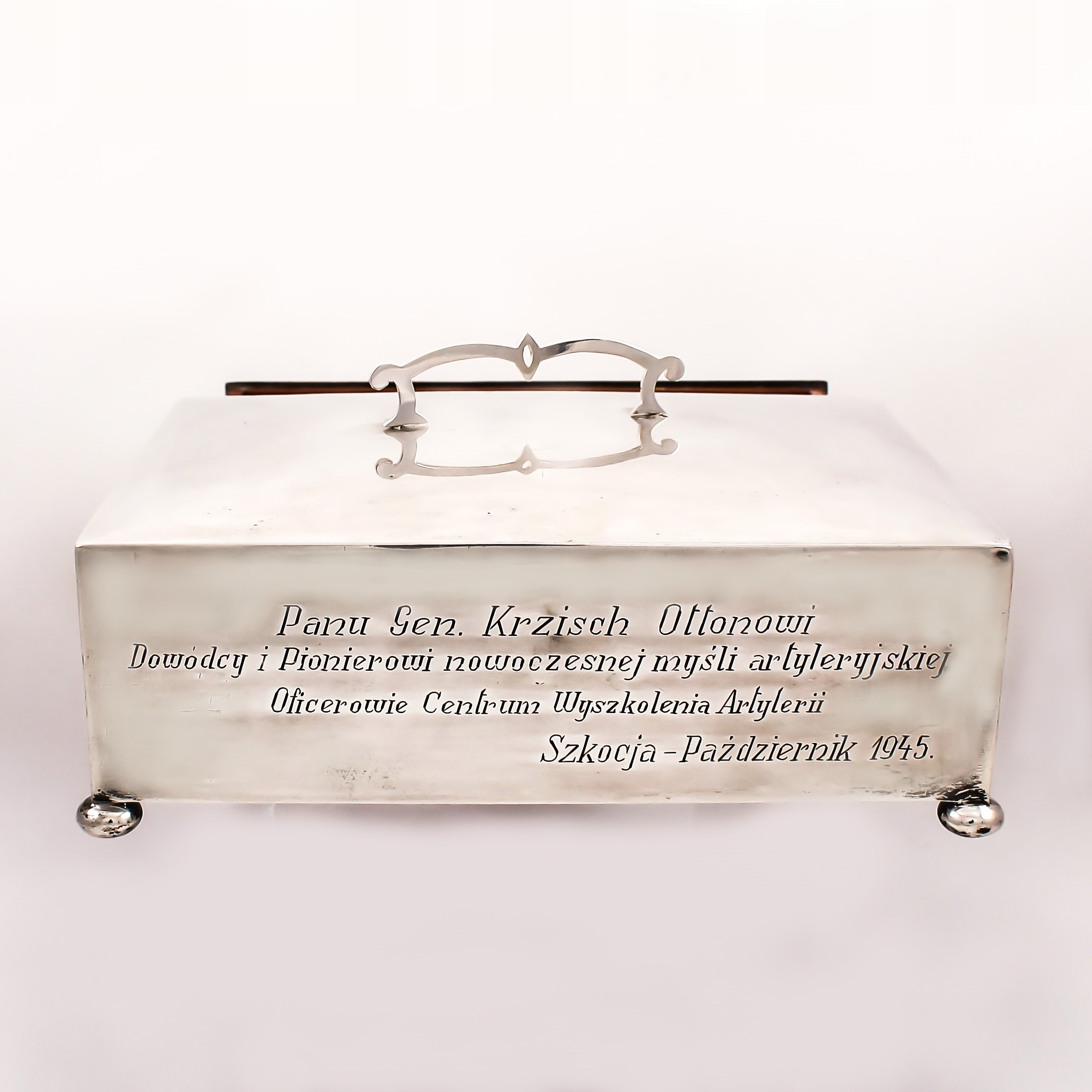 На гравюрі написано: «Містер ген. КРЗІШ ОТТОН, КОМАНДИР І ПІОНЕР СУЧАСНОЇ АРТИЛЕРІЙНОЇ ДУМКИ, ОФІЦЕР АРТИЛЕРІЙСЬКОГО НАВЧАЛЬНОГО ЦЕНТРУ. ШОТЛАНДІЯ – ЖОВТЕНЬ 1945 РОКУ
