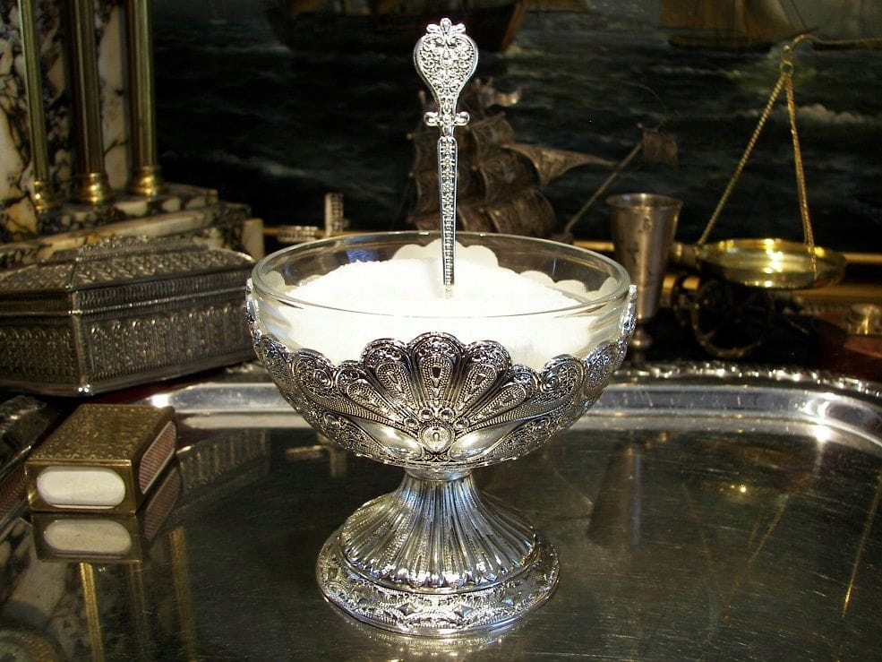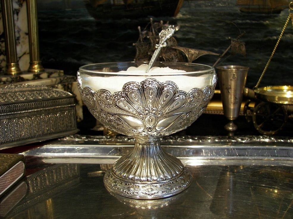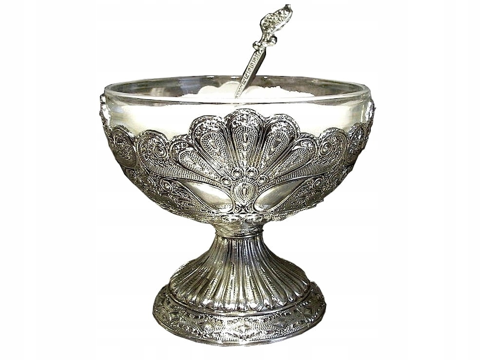 Запрошую придбати чудову чашу або, можливо, чудово декоровану цукерницю з мотивом, який ювелірні майстри називають «філигрань». Звичайно, оригінальна філігрань складається зі з’єднаних разом дротів. Весь виготовлений з кольорового металу, сплаву цинку. покрита шаром срібла (ПЛАСТИНА) Різноманітність оздоблення робить виріб ніби витягнутим із казки тисячі й однієї ночі. Цей предмет може мати багато застосувань. Десерти, морозиво, фрукти, мед, цукор, що завгодно, скло можна легко мити, а краса цієї «чашки» справді казкова. Це може бути гарною ідеєю для оригінального подарунка для когось особливого.
