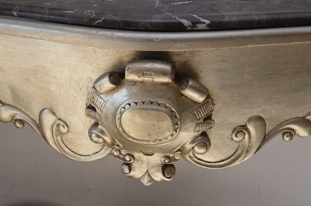 Привіт, сьогодні я хотів би запропонувати вам неймовірний сріблястий дерев’яний консольний стіл у стилі модерн із мармуровою стільницею.