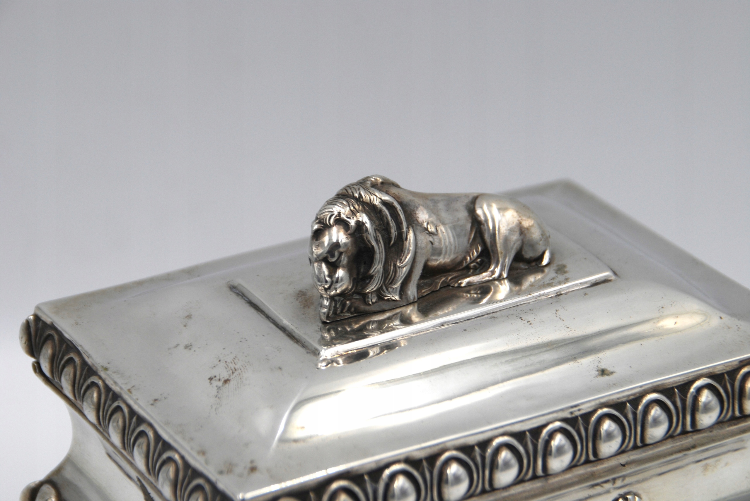 Чотири ноги, прикрашені кігтями лева, і фігура сплячого лева на кришці коробки.