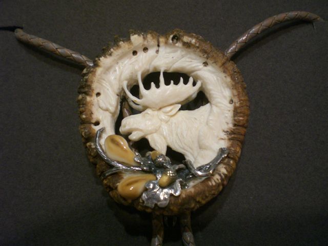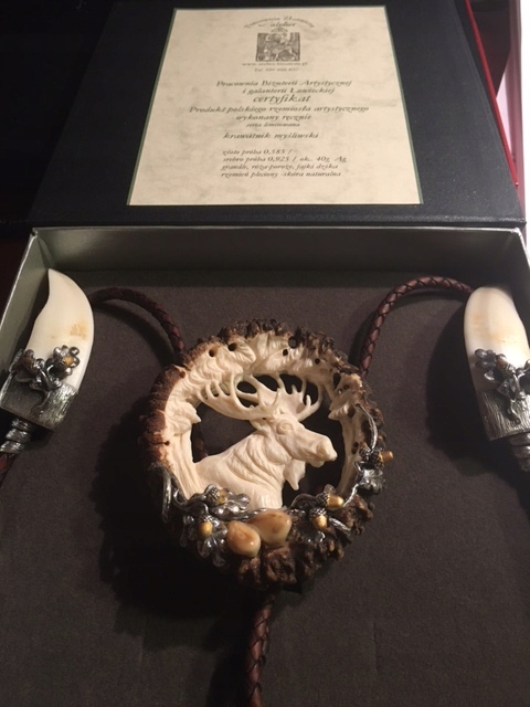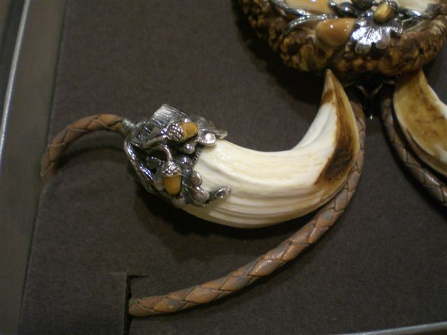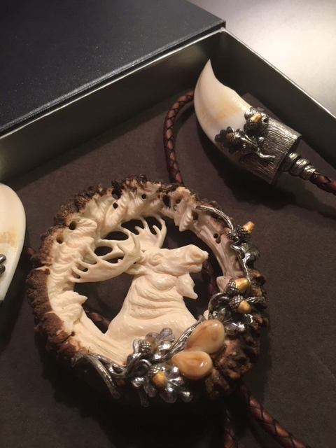 Мотив полювання, вирізьблений на троянді з пантів, і шабля або труба кабана в обрамленні срібних лісових мотивів
