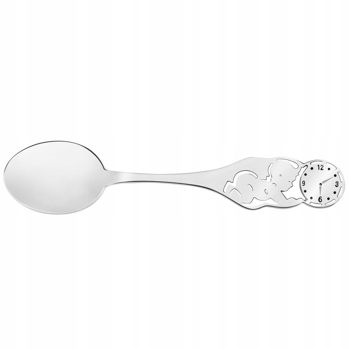 Ложка виготовлена зі срібла, що гарантує її довговічність. . На ручці зображено складну фігурку маленької дитини та циферблат годинника.