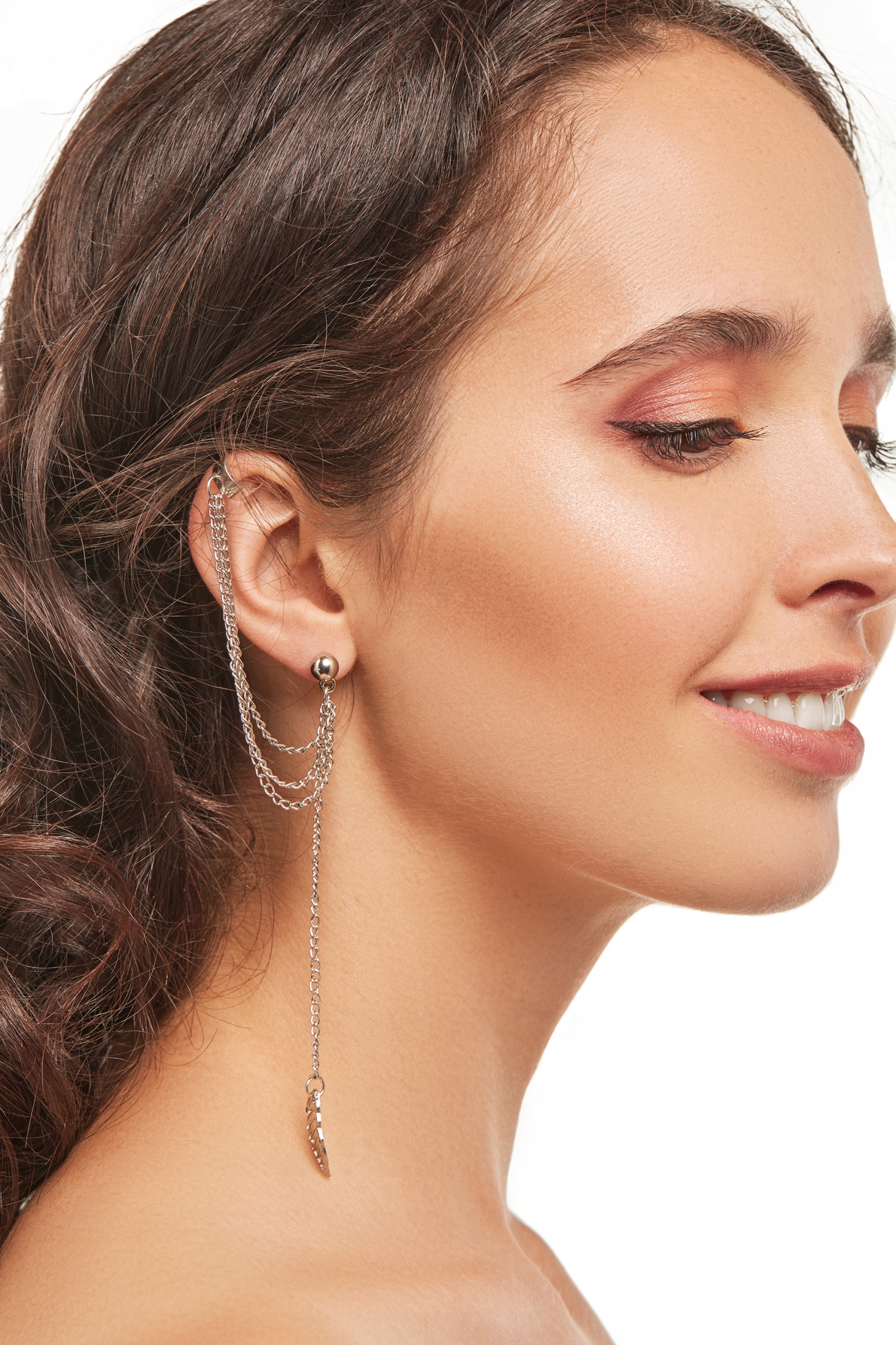➤ сережка в правому вусі, виготовленому з гіпоалергенного сплаву. Ювелірні вироби безпечно кріпляться до вушної частки з паличками, які захищені металевою основою.