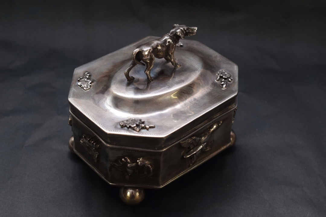 Красива цукорниця у формі коробки XIX століття, що підтримується на чотирьох ніжках профільованою кришкою, встановленою на петлі. На кришці цукорниці зображений величний мисливський пес - теж зі срібла. Срібло з надзвичайно багатим гравіюванням. З боків цукорниці є численні прикраси.