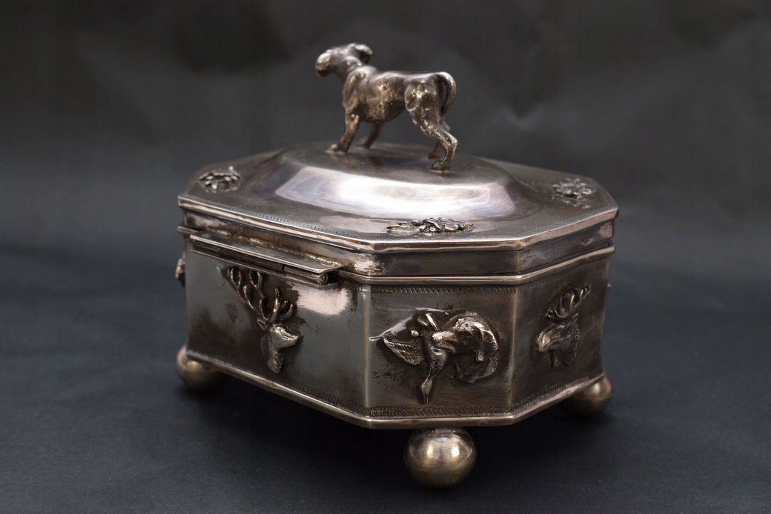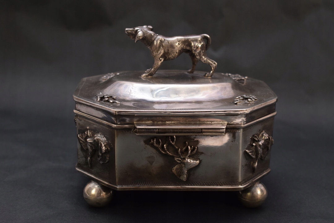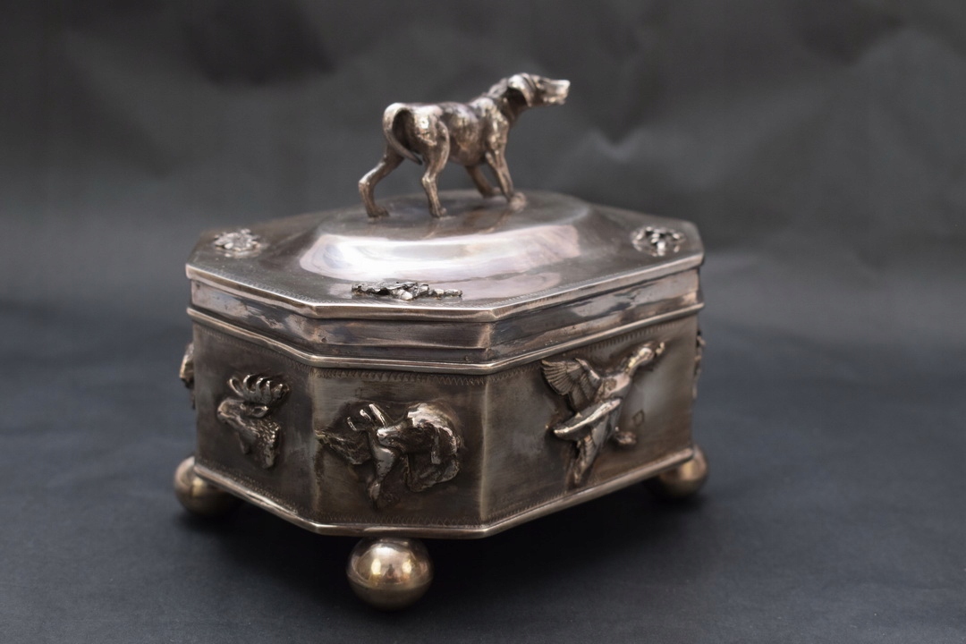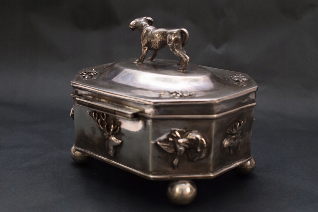 Срібна мисливська цукорниця - мисливська собака - царська Росія, срібло 84 проби 332 г