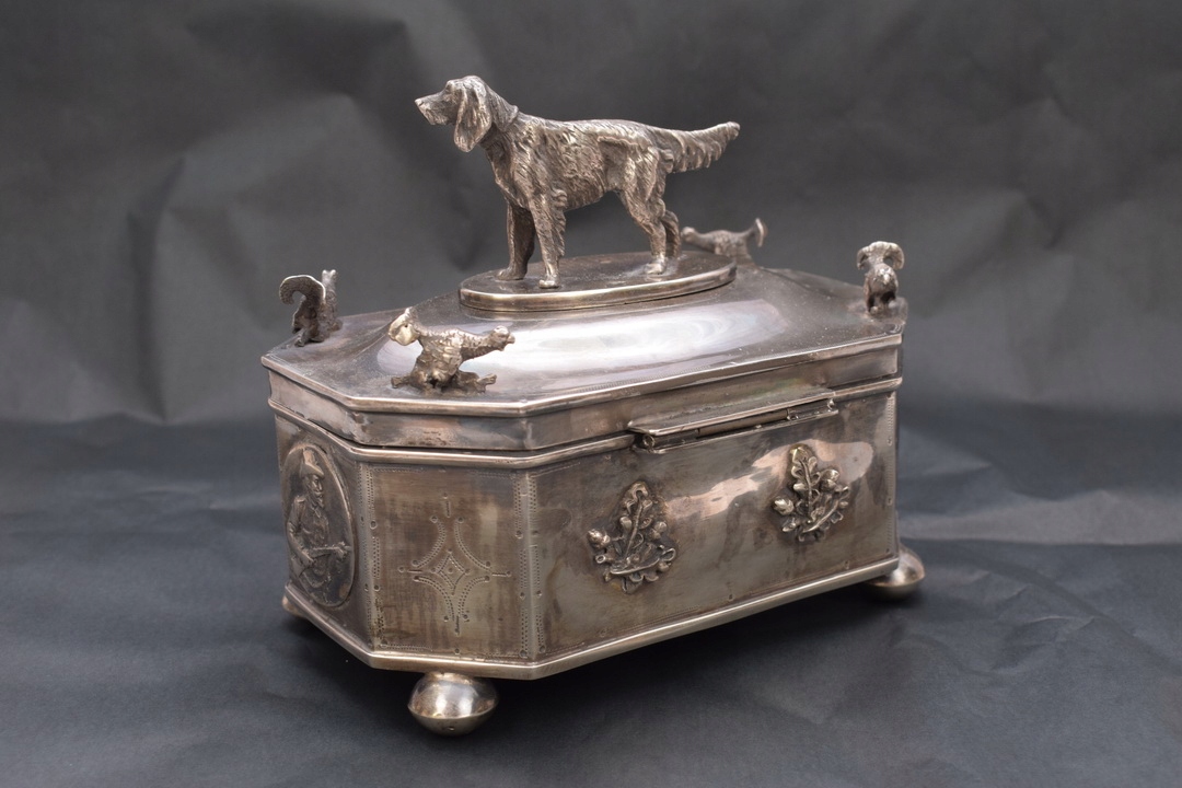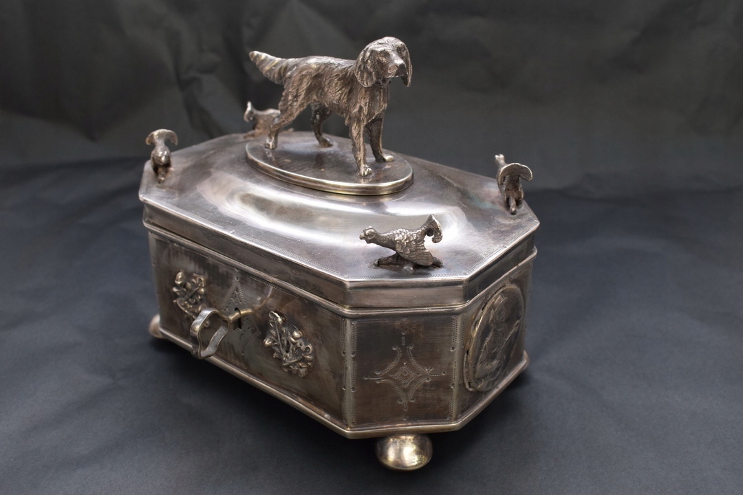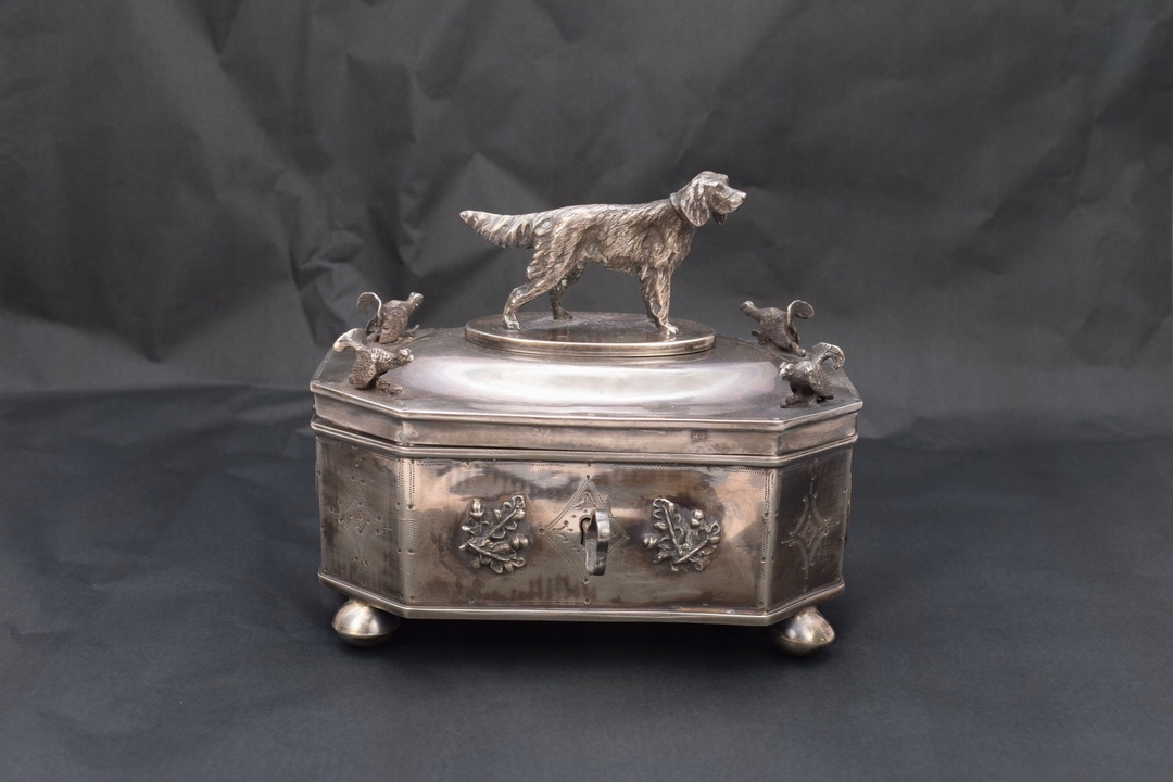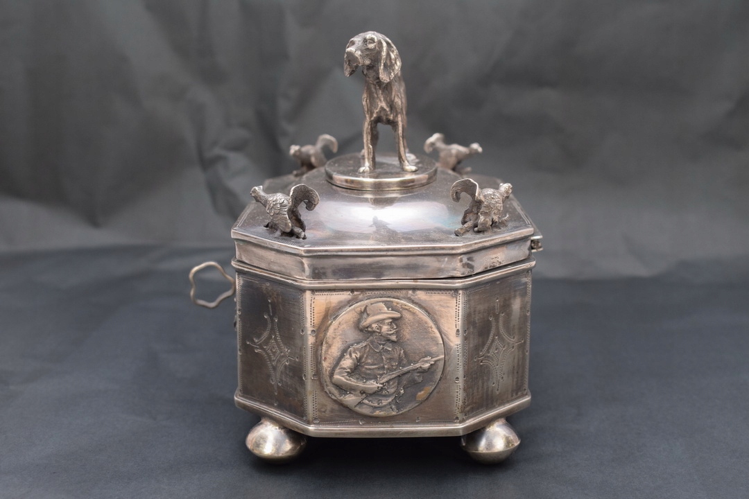 Прекрасна цукорниця у формі коробки XIX століття, що підтримується на чотирьох ніжках із профільованою кришкою, встановленою на петлі. На кришці цукорниці зображений величний мисливський пес - теж зі срібла. Срібло з надзвичайно багатим гравіюванням. З боків цукорниці є численні прикраси.