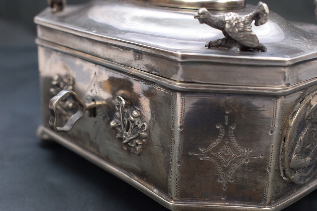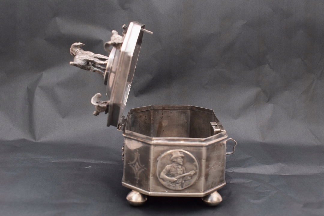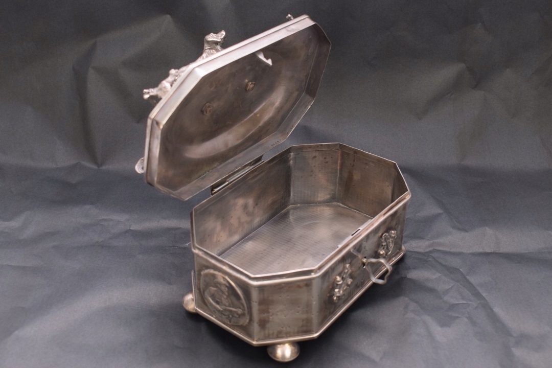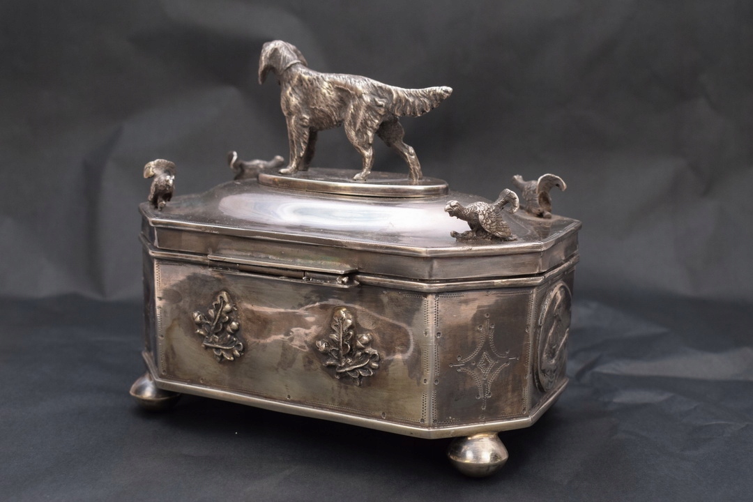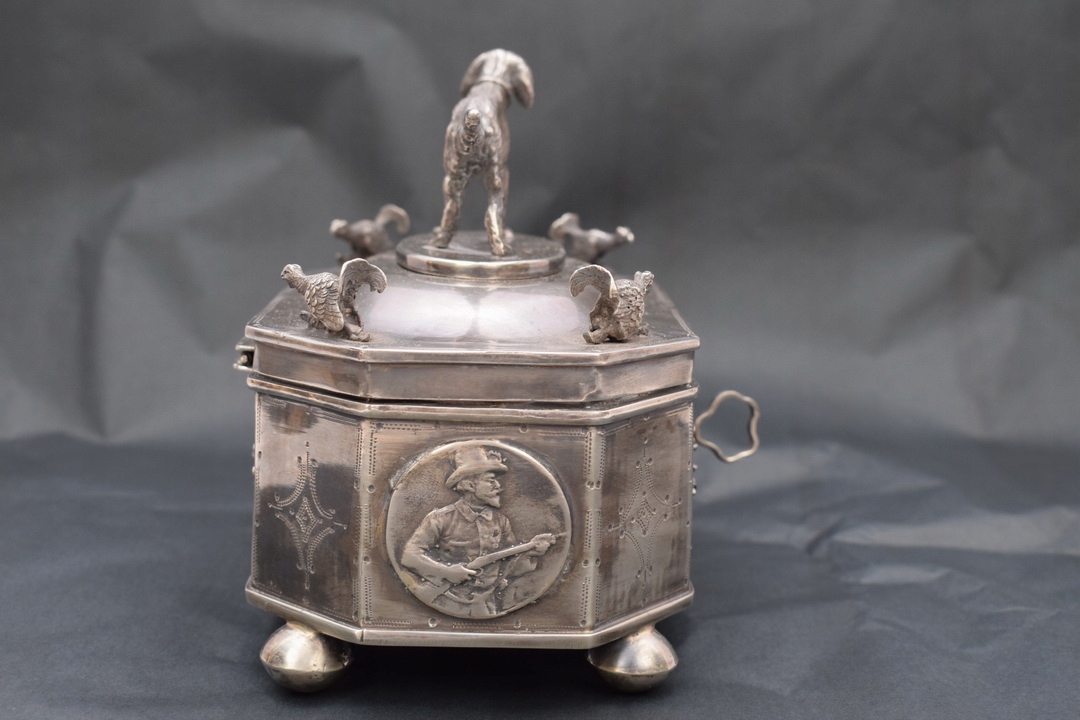 Прекрасна цукорниця у формі коробки XIX століття, що підтримується на чотирьох ніжках із профільованою кришкою, встановленою на петлі. На кришці цукорниці зображений величний мисливський пес - теж зі срібла. Срібло з надзвичайно багатим гравіюванням. З боків цукорниці є численні прикраси.