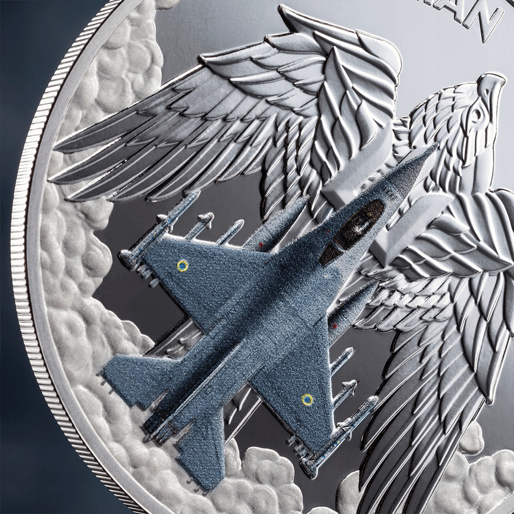 Срібна колекційна монета — данина безстрашним авіаційним підрозділам ЗСУ та пам’ять про легендарна пілотажна група «Українські соколи». Команда складалася з винищувачів МіГ-29, пофарбованих у національні кольори та оснащених димогенератором. Монетний двір XXI відповідає за виготовлення номіналу, завдяки чому монета вирізняється детальною обробкою. Крім того, вона була оброблена барвистим УФ-лаком, що надає монеті унікальний вигляд. Ціна срібла обмежена лише 1000 штуками.