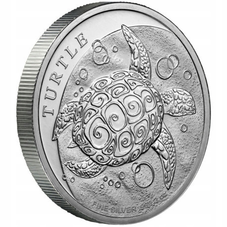 На зворотному боці срібного виробу з 2014 року ми бачимо яструбину черепаху, яка пливе океаном. глибини. У самому верху розміщено напис Черепаха, а внизу вказано вагу монети та вміст срібла в металі, з якого вона виготовлена. На аверсі ми бачимо лівий профіль нинішнього правителя Великої Британії короля Карла III, з цього боку також номінал 5 новозеландських доларів. У самому низу вказано рік випуску цінного паперу.