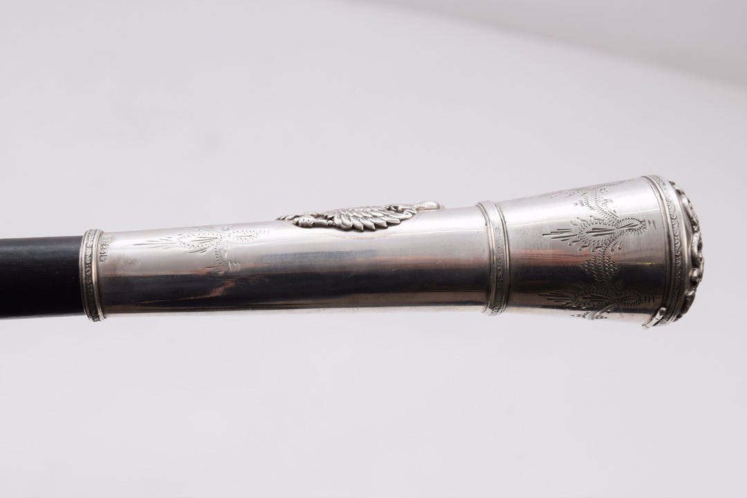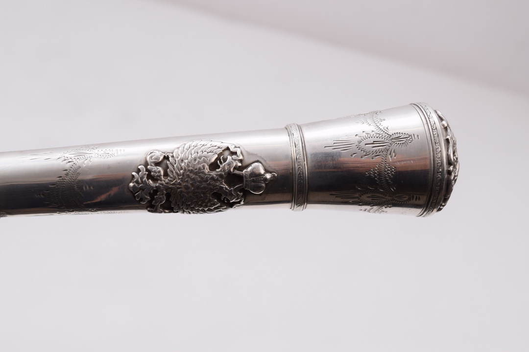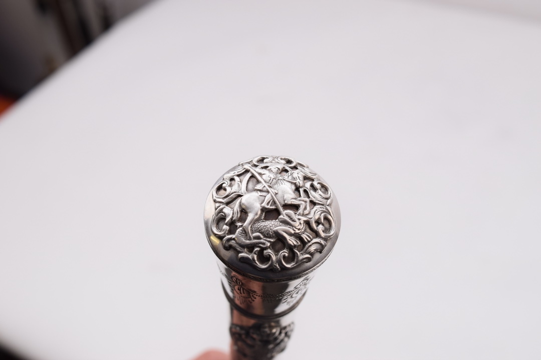 Лицька частина жезла увінчана царськими орлами, верхня — св. Георгій на коні.