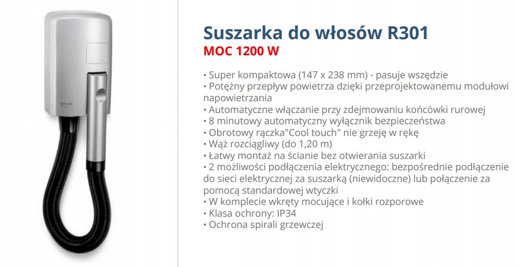 Елегантна сушарка готелю R300 - надійний продукт від швейцарського лідера серед виробників сушарки - Валера. Срібна сушарка адаптована для встановлення стін. Його загальна потужність - 1200 Вт.