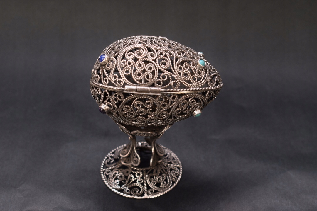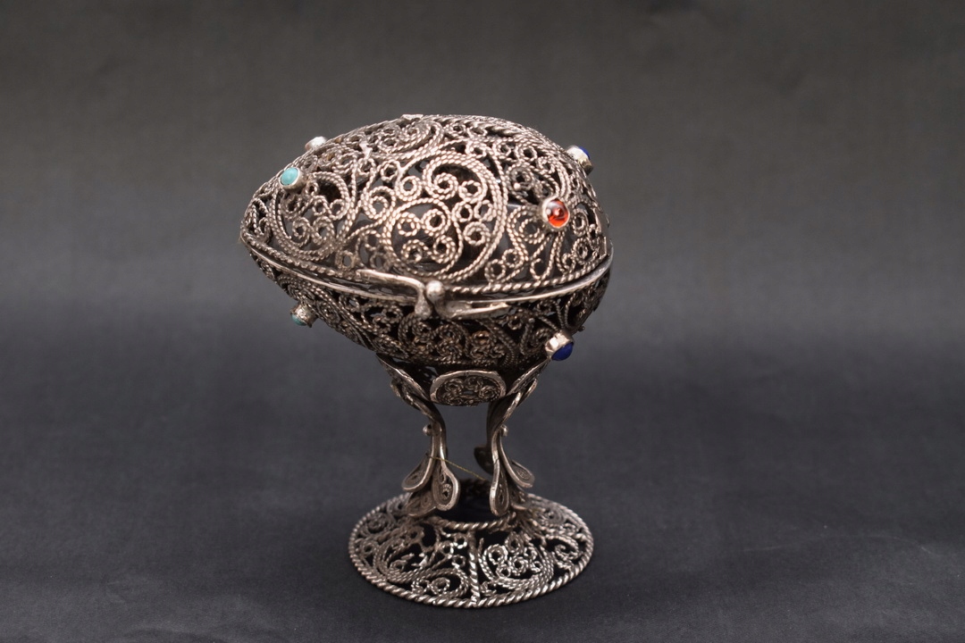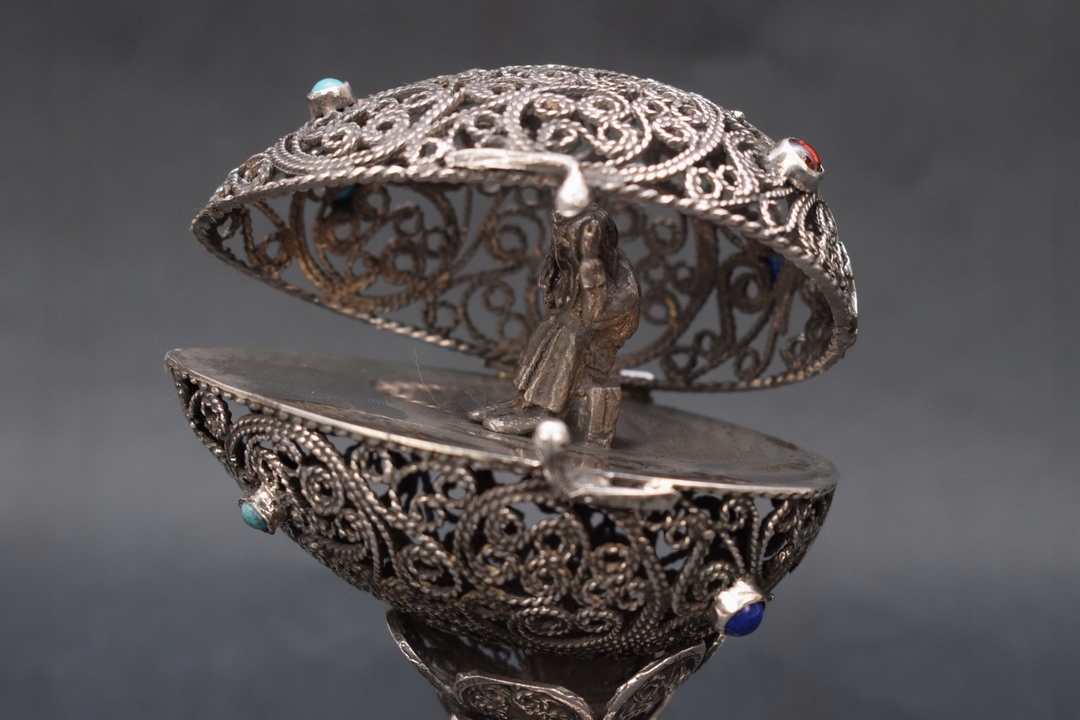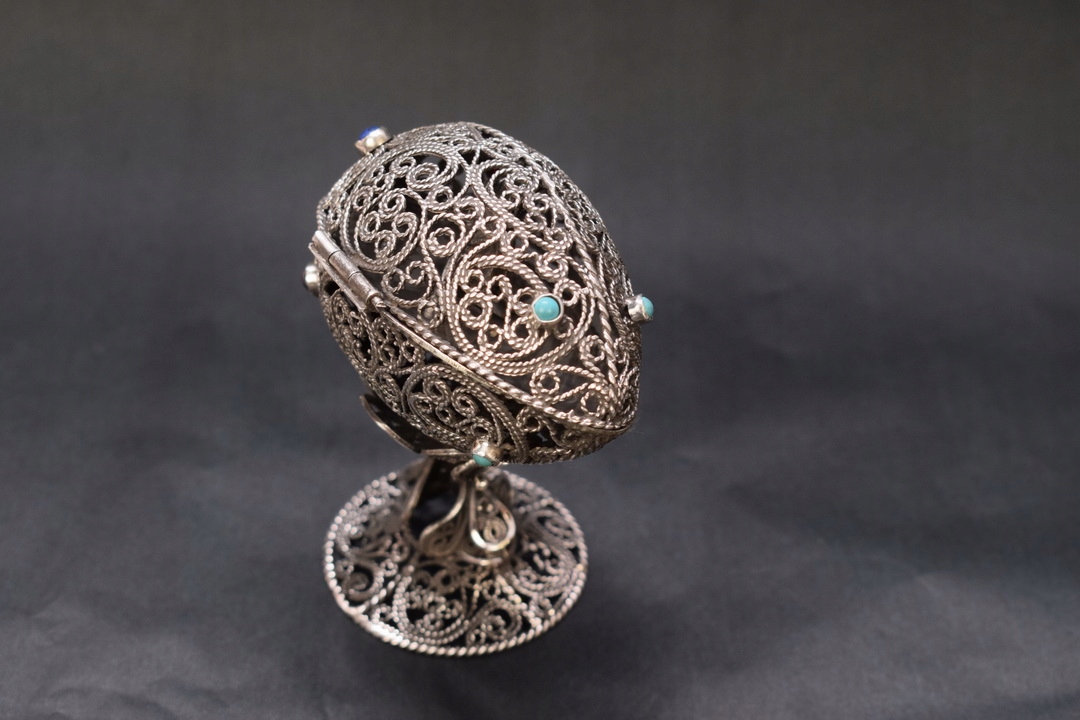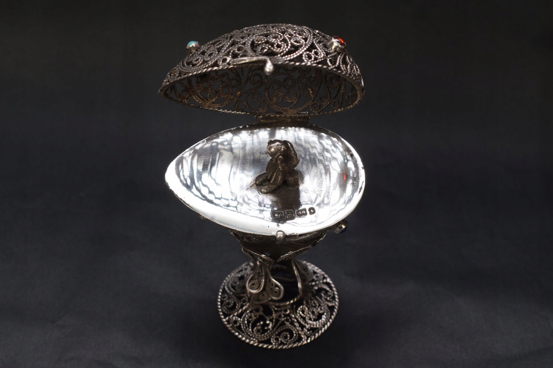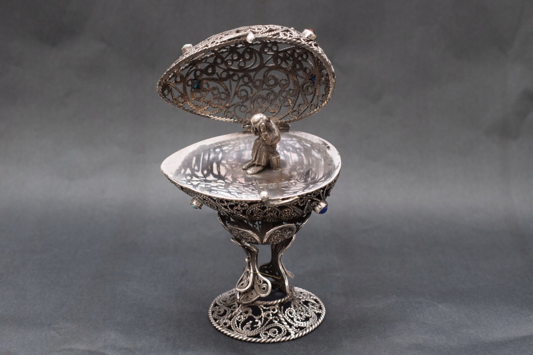 Срібне ажурне єврейське яйце - Egg Russia 84 - Розкрите на підставці