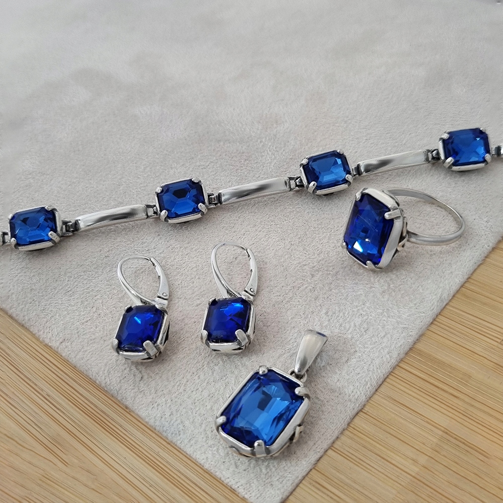 Оксидована та полірована каблучка з синім кристалом. Цікавий колір кристала чудово гармонує зі срібною оправою, роблячи прикрасу елегантною до будь-якого стилю.
