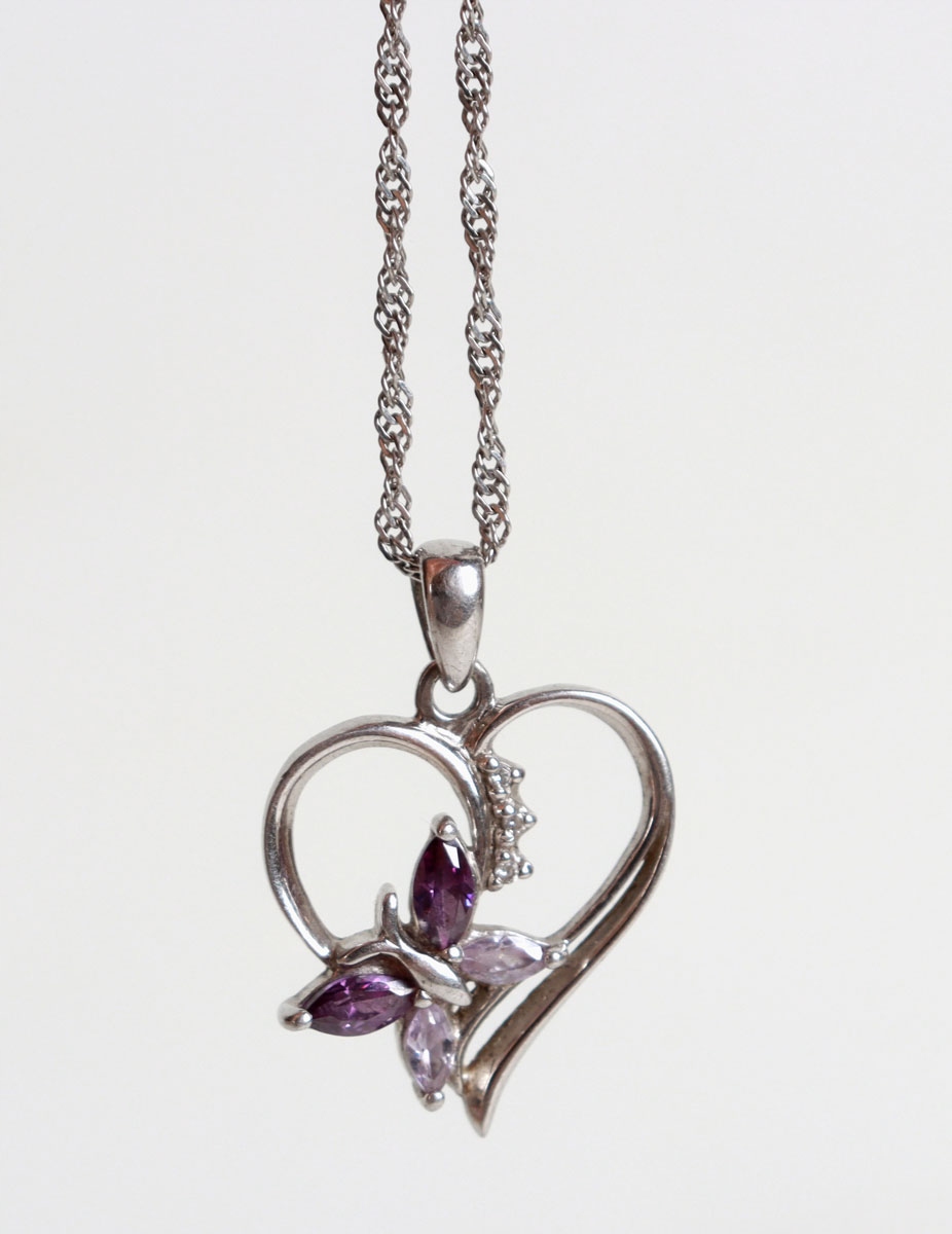 Намисто зі срібла 925 проби. Намисто увінчане кулоном у формі серця, у нижній частині — метелик, прикрашений двома аметистами та двома гірськими кристалами.