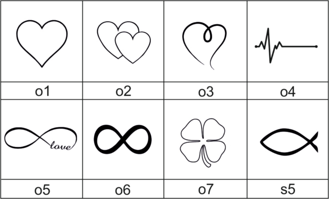 Нижче наведено доступні шрифти та символи, які можна використовувати для гравіювання тексту на обручках. Після покупки вкажіть номер шрифту, інакше гравіювання буде виконано шрифтом №1.