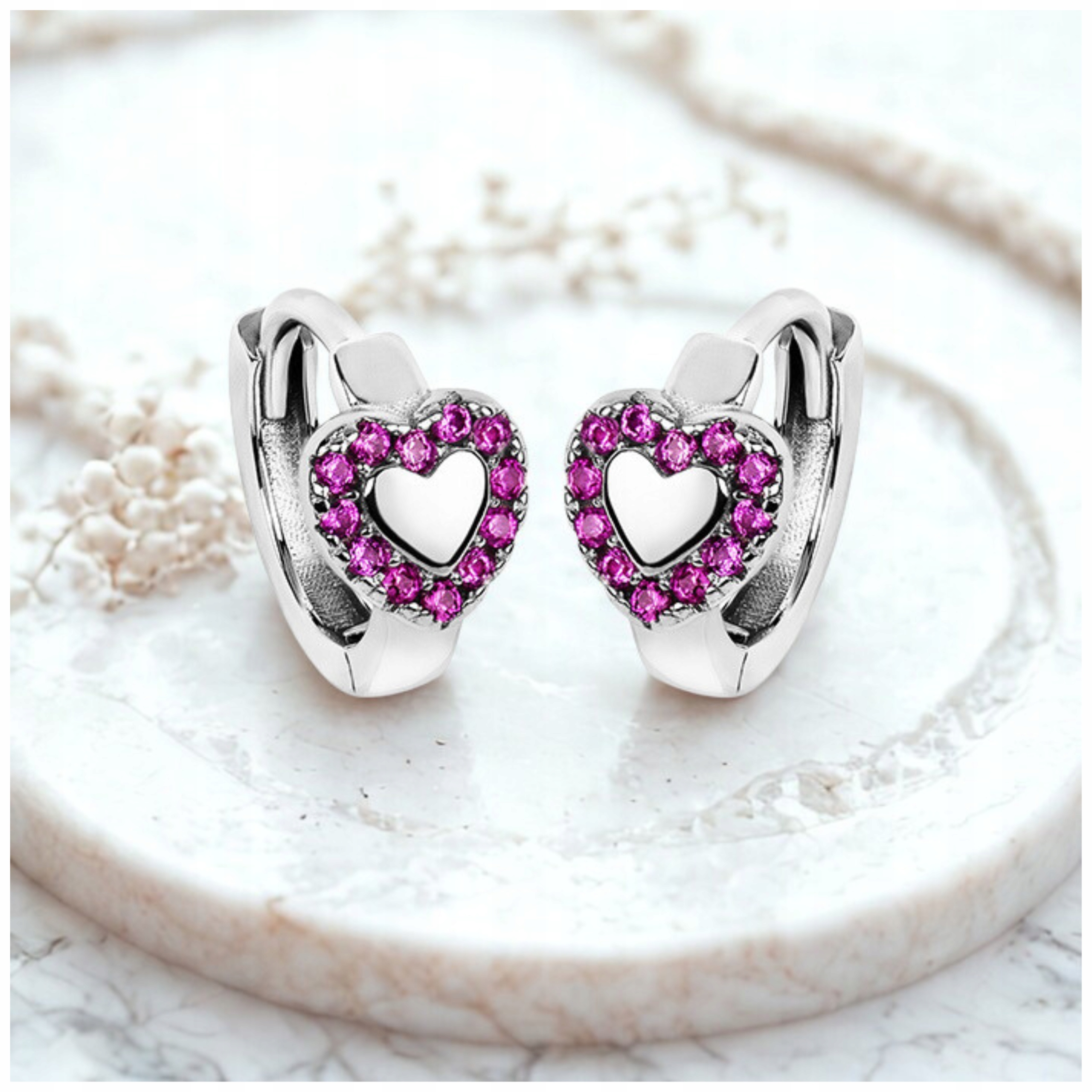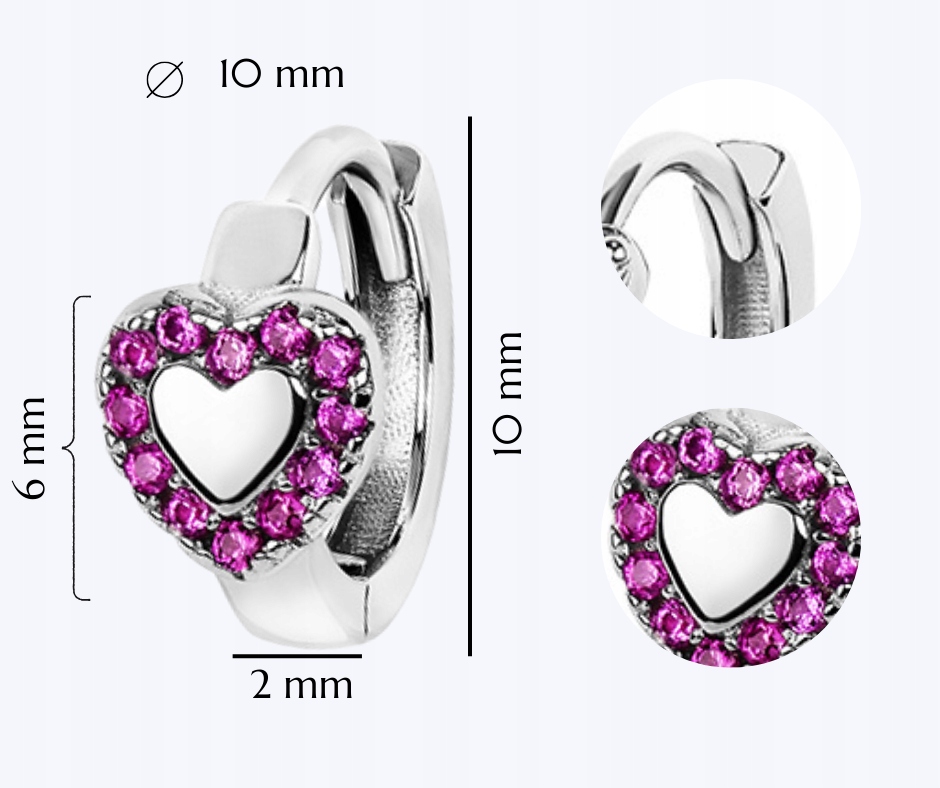 Срібні сережки-кільця для дівчаток зі срібла 925 проби. Сережки оздоблені цирконами малинового кольору, розташованими у формі серця, які підкреслюють їхню красу та природний вигляд.