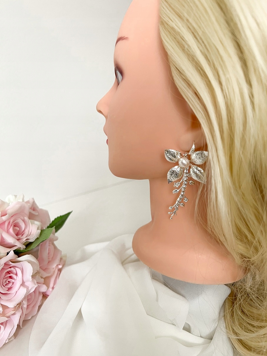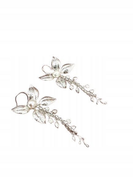 Довгі висячі сережки «Срібна квітка» — це поєднання сільського стилю, бохо-гламу та казки. Все це завдяки поєднанню мотиву листя, цирконів і перлів.