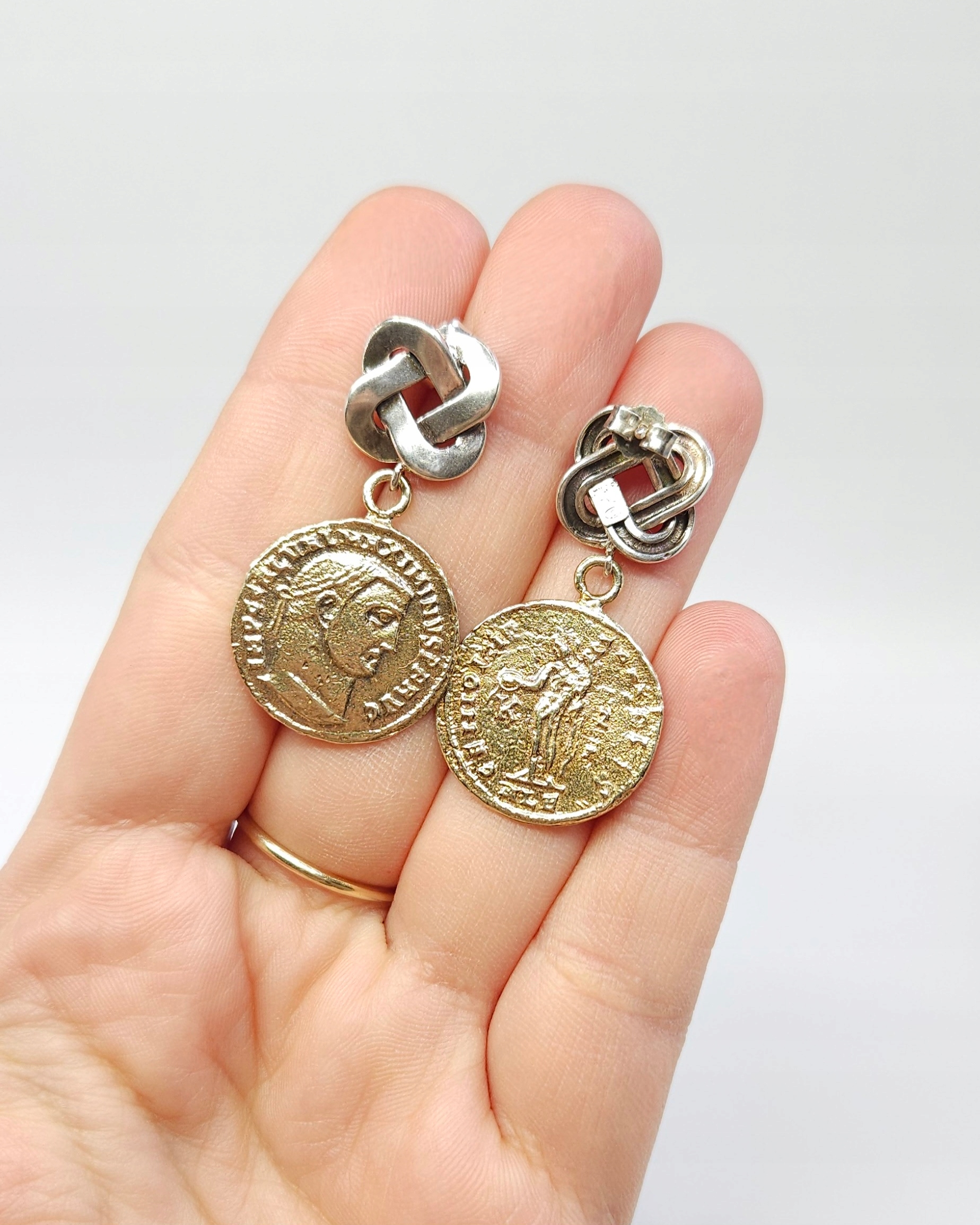 срібні сережки - палички з імітацією монет, виготовлених із золотистого срібла, у верхній частині, прикрашеній мотивом вузла
