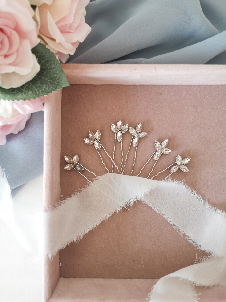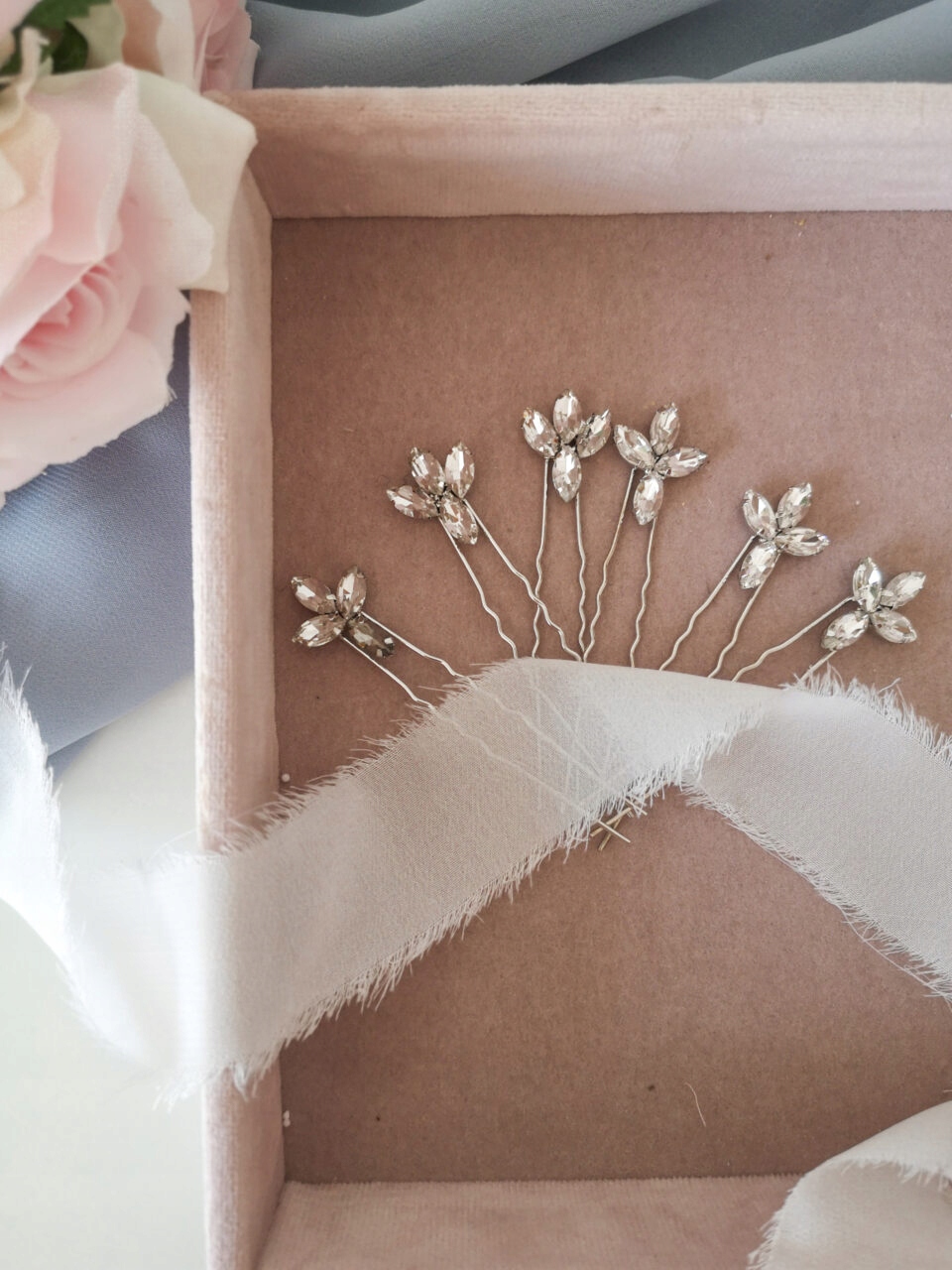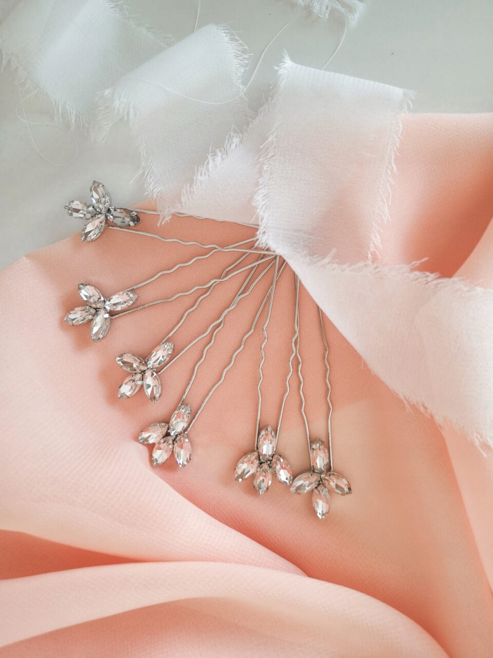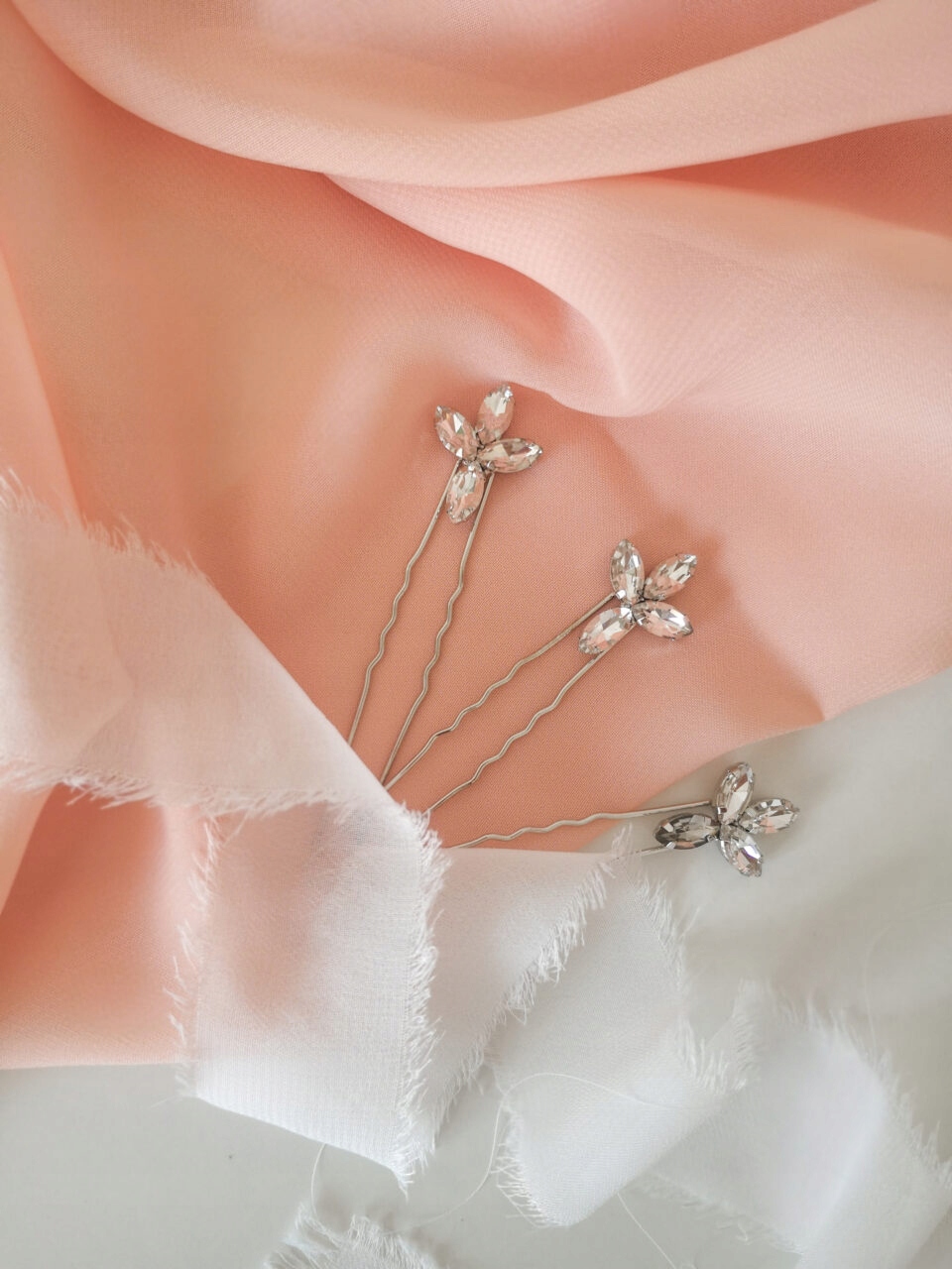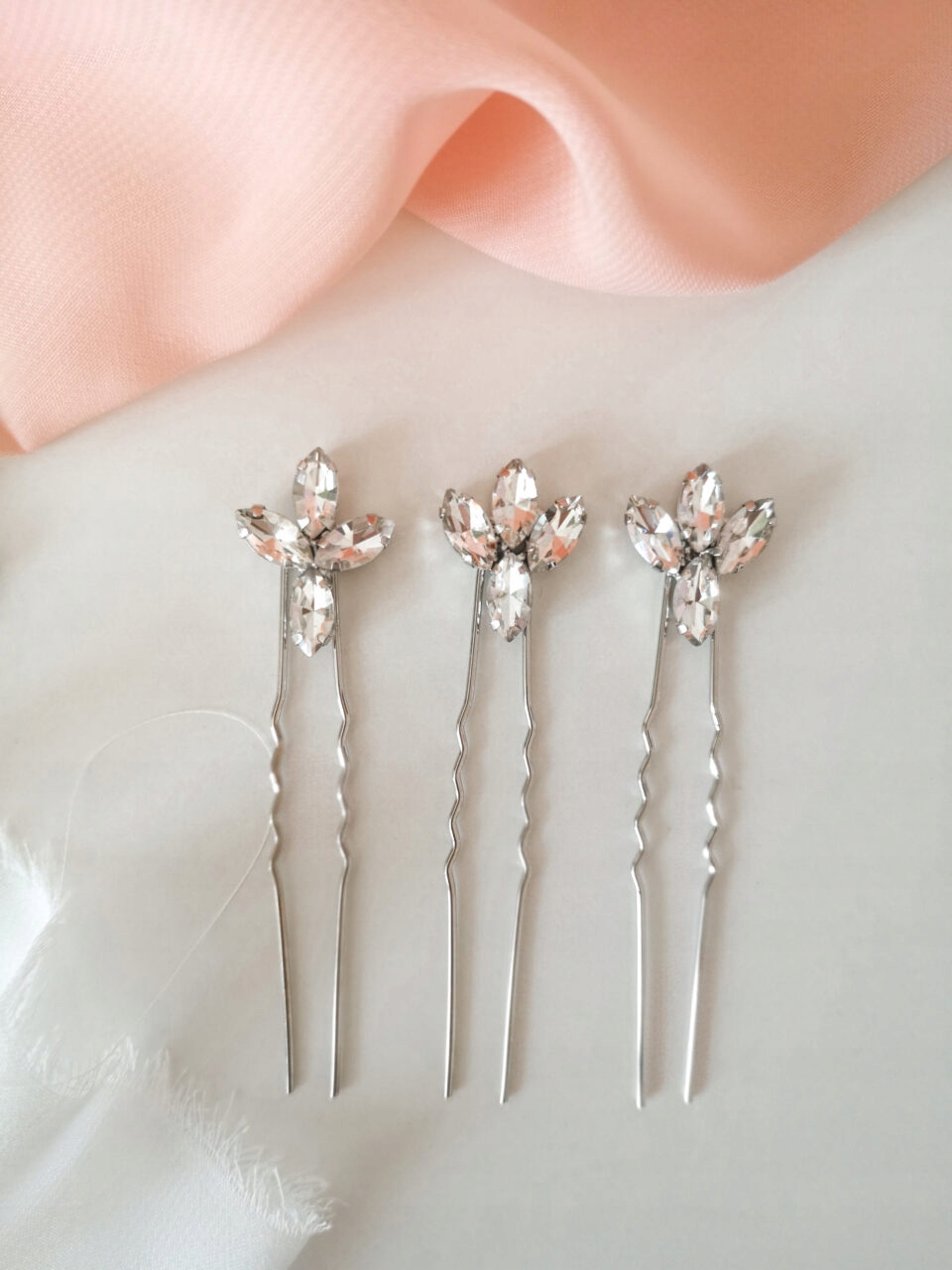 Набір шпильок Glamour Silver включає три шпильки з цирконами в срібній оправі. Дуже ніжний, але в той же час ідеально підходить до гламурного та класичного стилю. Їх можна поєднувати з іншими весільними прикрасами для волосся, наприклад, гребінцями або пов'язками. Вони також чудово підійдуть як самостійна прикраса чи ніжне доповнення до фати.
