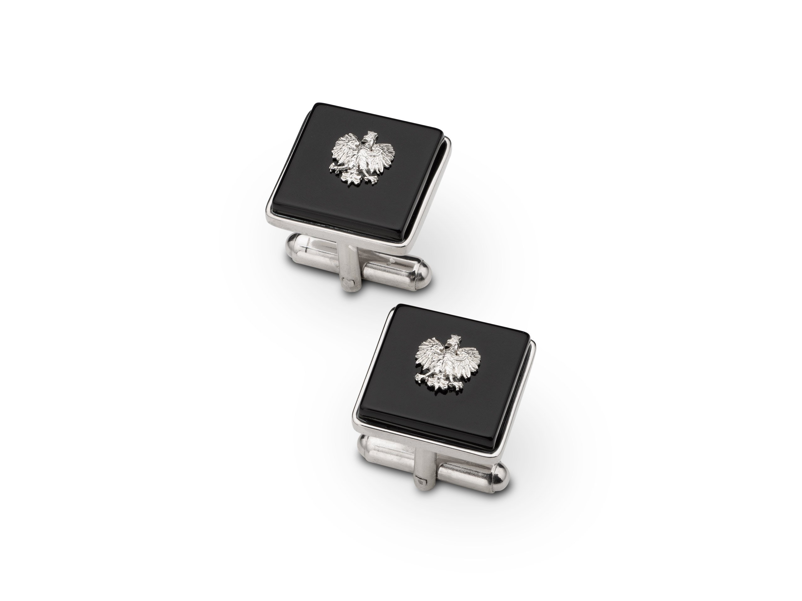 Чоловічі запонки прямокутної форми з полірованого срібла 925 проби та чорного оніксу - натурального каменю. Запонки прикрашені маленьким зображенням нашого державного герба - орла з короною. Орли також виготовлені зі срібла 925 проби.