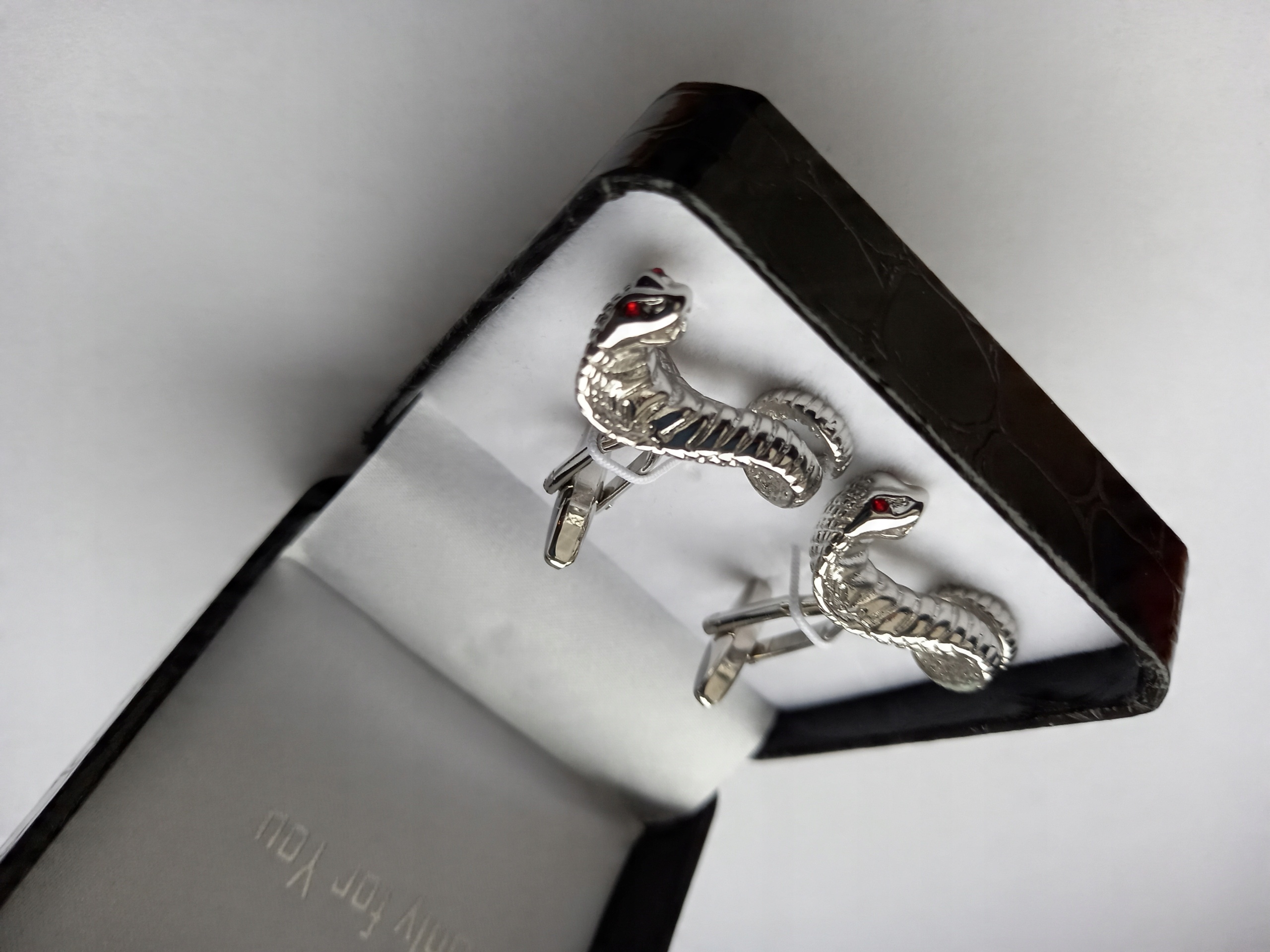 Набір сорочкових запонок від Exciting. Запонки виготовлені з дорогоцінного металу. Набір з двох запонок упакований в картонну коробку чорного або синього кольору. За додаткову плату ми можемо упакувати запонки в ексклюзивний чохол зі зміїним малюнком, зображеним на наступних фото.