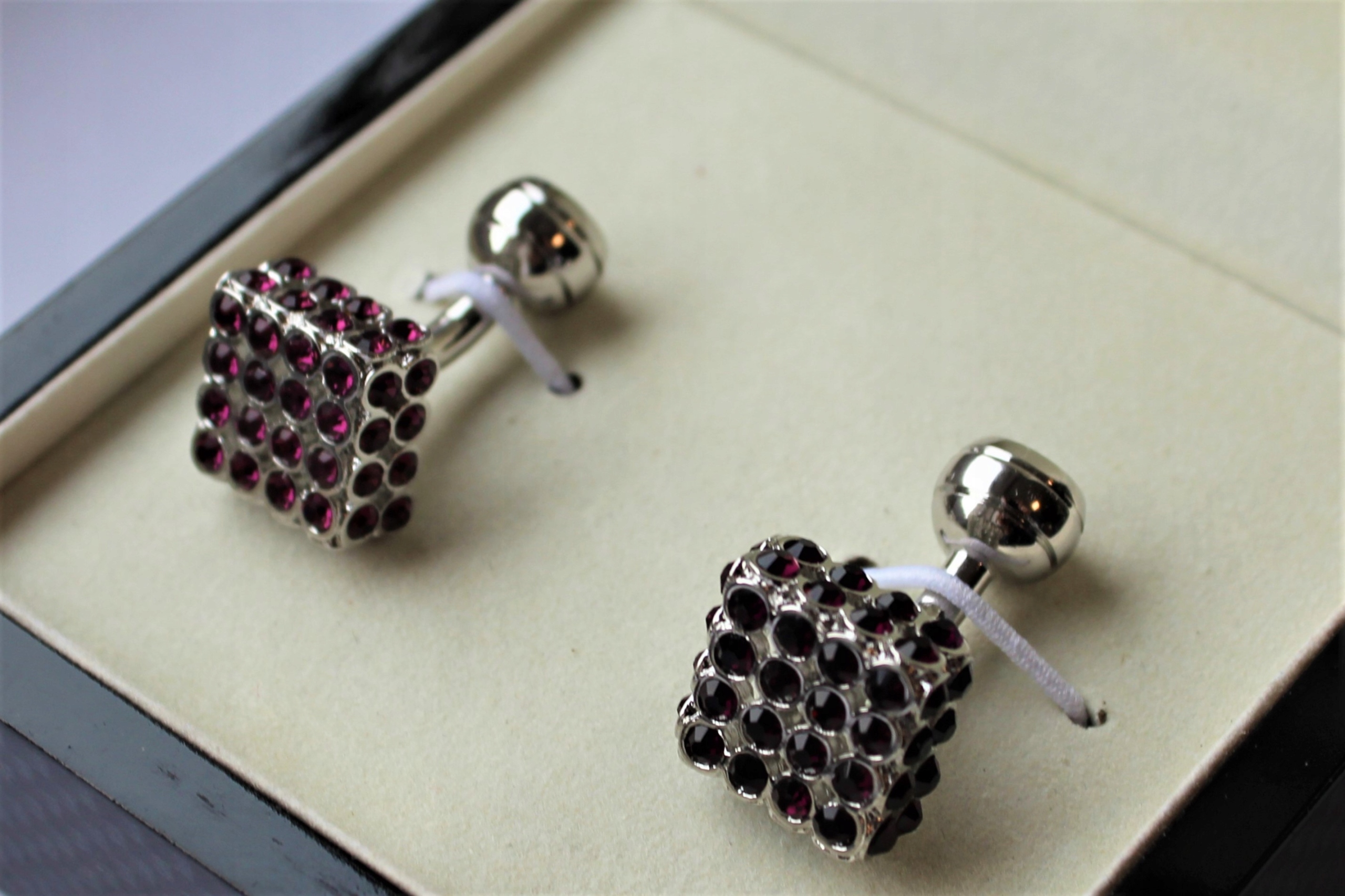 Красиві сорочкові запонки з рожевими та вересовими цирконами виробництва відомої польської фабрики запонок. Набір із двох запонок упакований у ефектну дерев’яну коробку з візерунком Carbon.