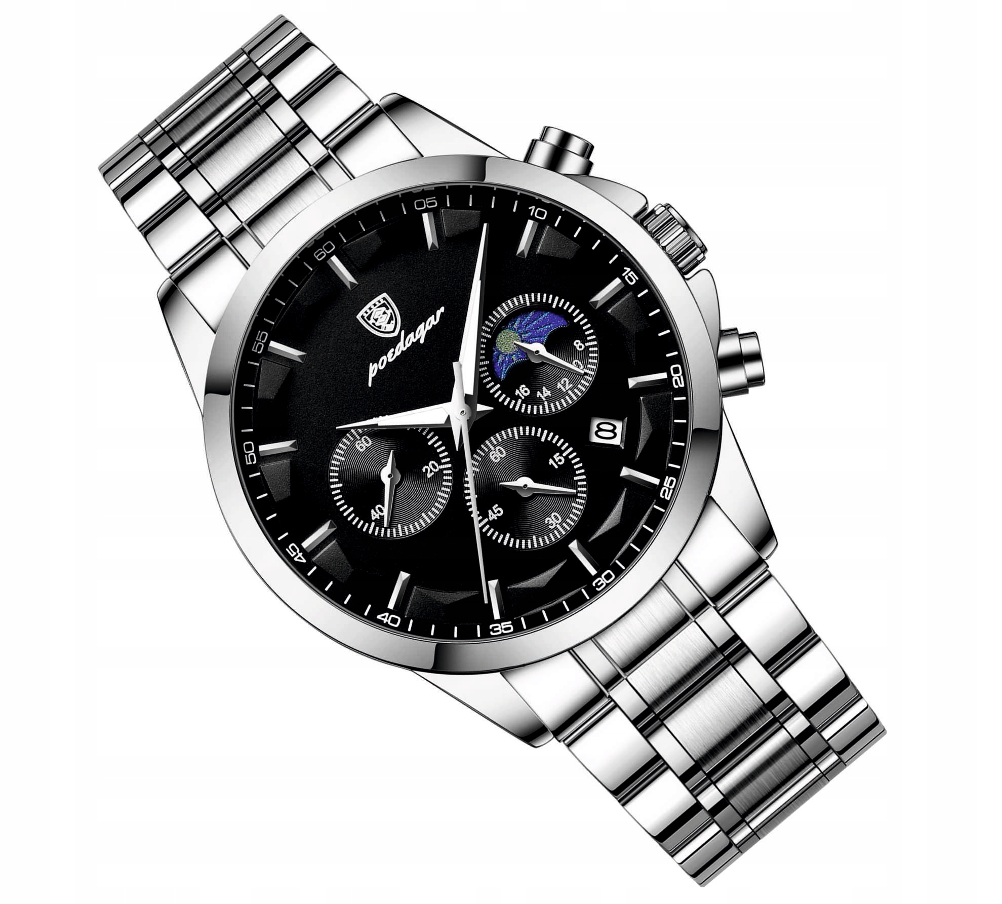 Наручний годинник POEDAGAR — чудова пропозиція для чоловіків, які цінують практичні рішення. Поєднання зручного сталевого браслета та елегантного циферблата зі злегка спортивним характером робить годинник ідеальним для будь-якого випадку. Функціональні хронографи включають секундомір, таймер зворотного відліку. Годинник має індикатор ДЕНЬ/НІЧ.