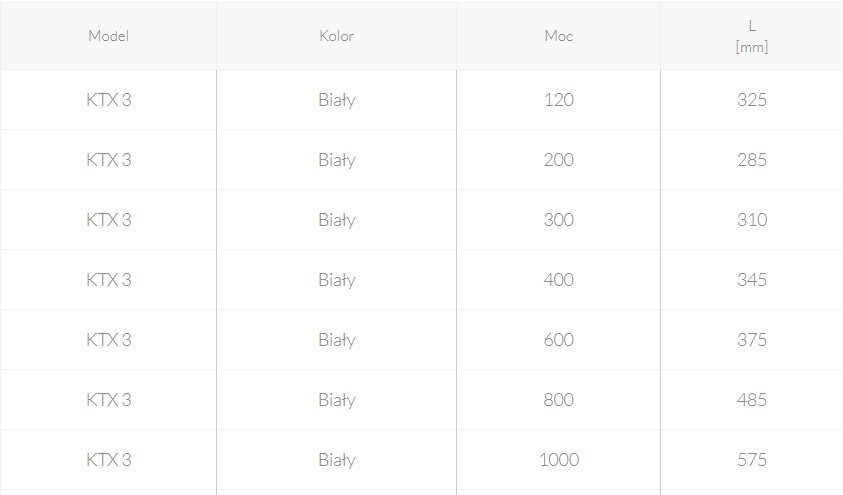 Довжина нагрівача залежить від його потужності - розмірів, наведених у таблиці нижче -