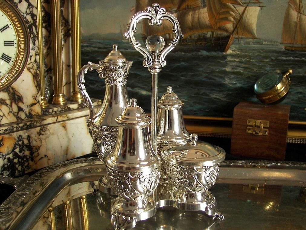 Я запрошую вас придбати надзвичайно красивий предмет. Це надзвичайно красивий, стилізований кабаре. Весь складається з 5 частин. Солі, перцеві перець, олія для олії (оцет і Маггі не підлягають сумніву), невелика ємність з ложкою та декоративна рамка. Сталь, прикрашена кулею, імітуючи кристал. Усі предмети виготовлені з не комерційного металу, покритого сріблом.