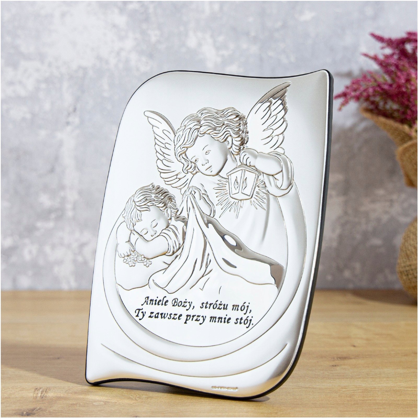 Картина із зображенням Ангела-охоронця з ліхтариком і молитвою «Ангеле Божий...» це чудовий подарунок до Святого Хрещення, Першого Причастя чи Дня народження дитини. Висока якість виготовлення, вишукане оздоблення, елегантна упаковка - все це створює унікальний сувенір на довгі роки... Картина також надзвичайно практична: вона має вбудовану підставку, завдяки якій ми можемо розмістити її на шафі чи комоді ящики, а також повісити на стіну.