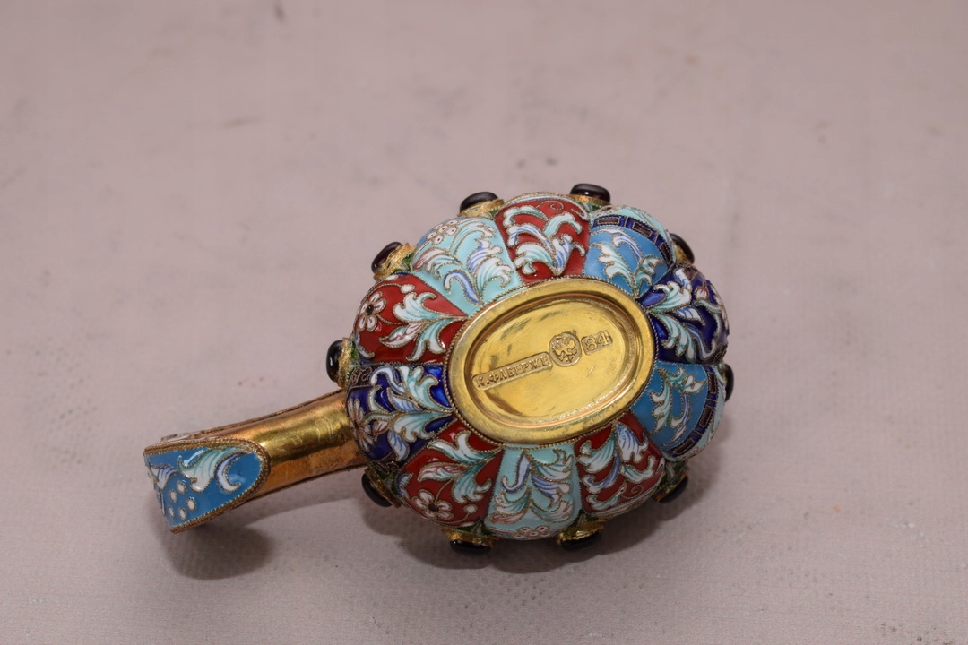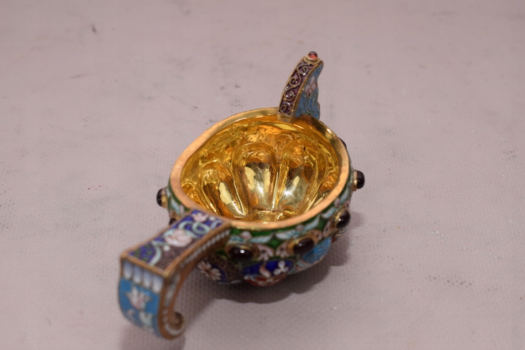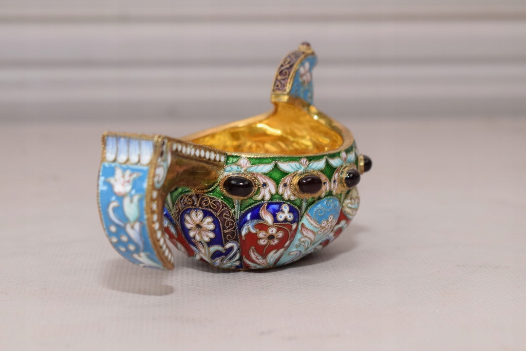 Тільне позолочене срібло, прикрашене різнокольоровою комірчастою емаллю.
