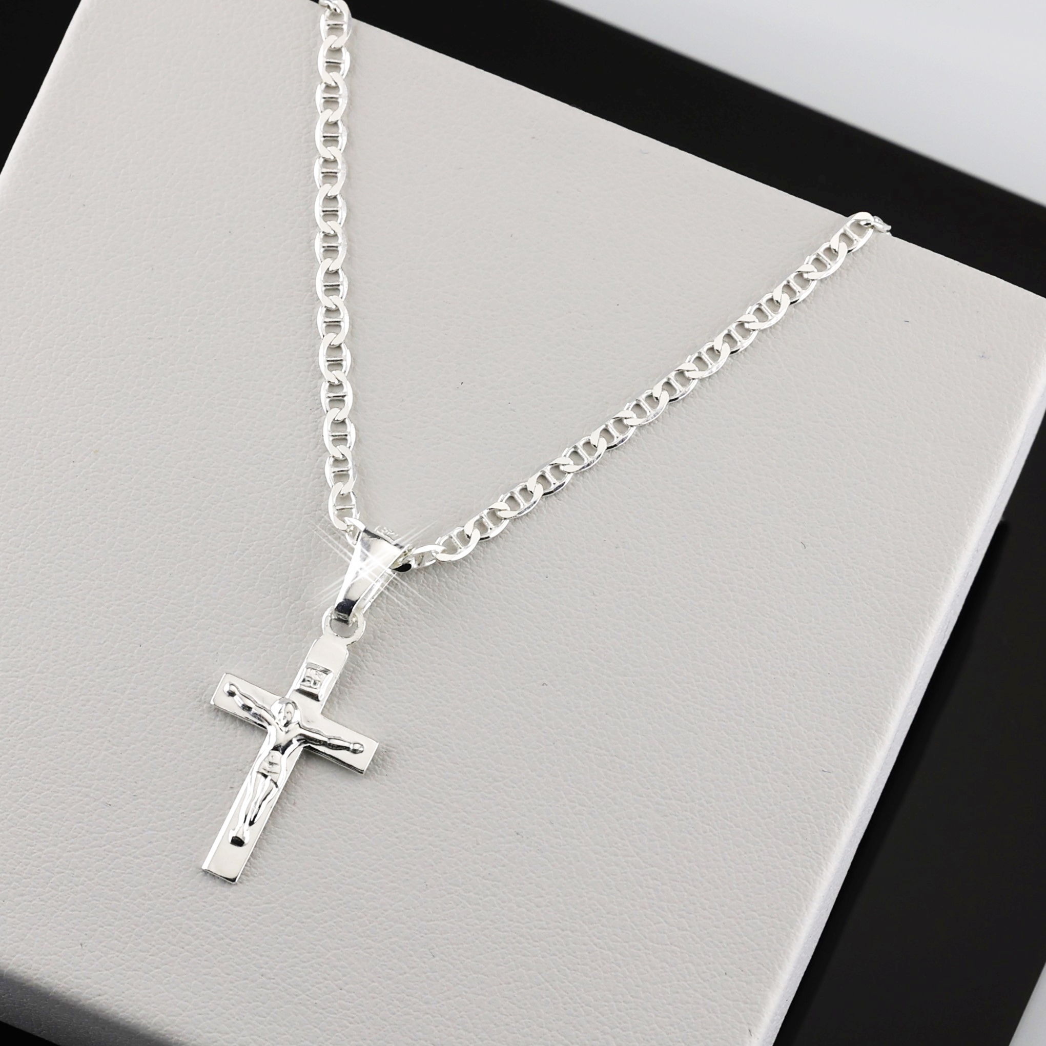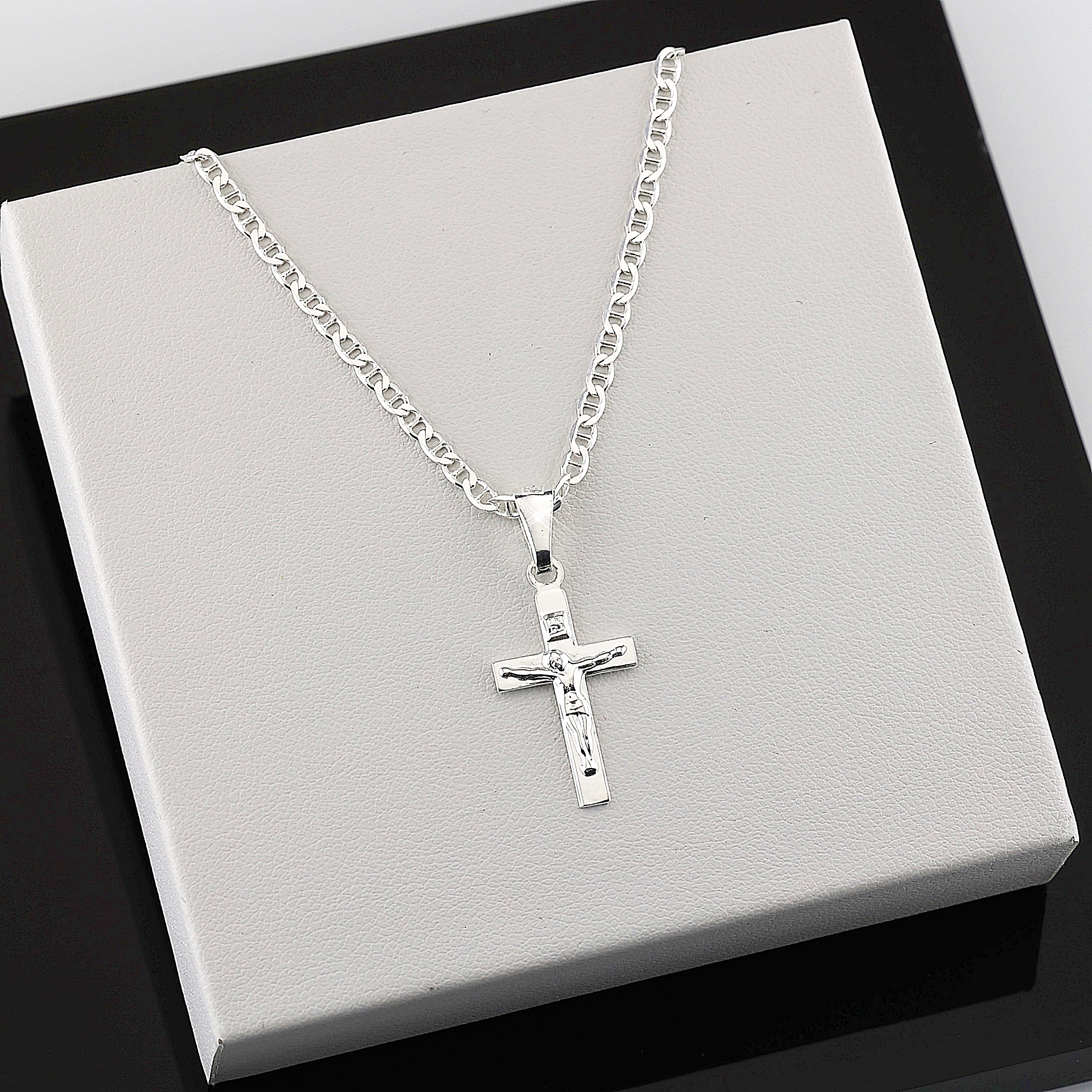 Відкрийте для себе вишукані ювелірні вироби, які випромінюють пристрасть і досвід у ювелірній справі! Наш ланцюжок із хрестом був ретельно виготовлений із високоякісного срібла 925 проби, що відображає нашу давню традицію ювелірної майстерності.