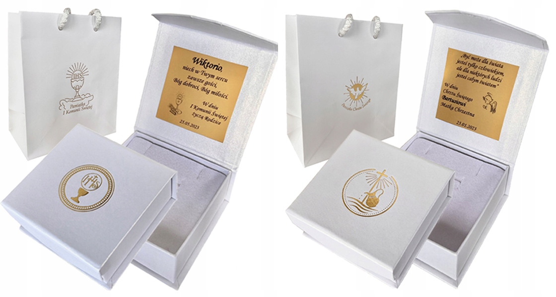 Після придбання додаткової послуги ваше замовлення включає преміальний набір упаковки: шкатулка з індивідуальною присвятою та подарунковий пакет. Ви можете вибрати скриньку для причастя, хрещення або універсальну скриньку. Присвята надрукована на золотому, блискучому папері, який об'єднується з кришкою коробки. Щоб запобігти випадковому відкриванню, ми використали магнітну застібку – просте та ефективне рішення.