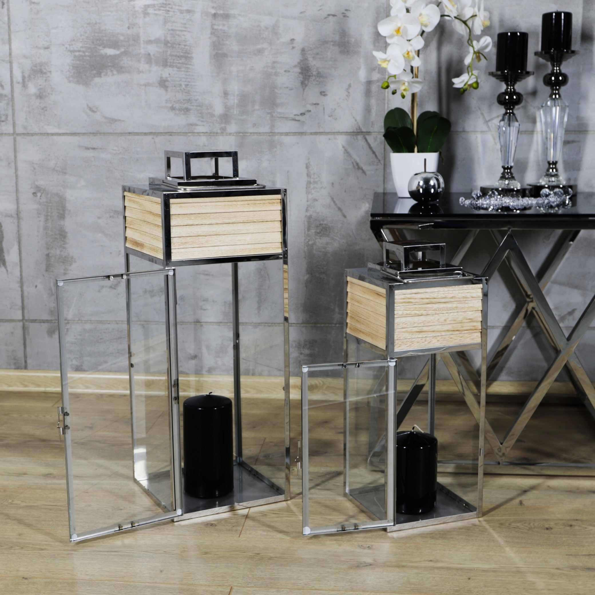 Представляємо вам елегантний металевий набір великих срібних ліхтарів срібла з нержавіюча стальb>. Набір складається з 2 ліхтарів: великого та середнього. Ліхтарі мають передні дверцята, що відкриваються, і всередині них можна розмістити натуральні або світлодіодні свічки, доступні на інших наших аукціонах, або інші прикраси чи композиції. Верхня частина ліхтарів оздоблена стильним деревом. Ліхтарі також мають ручки для зручного перенесення або підвішування. Бічні сторони всіх ліхтарів засклені.