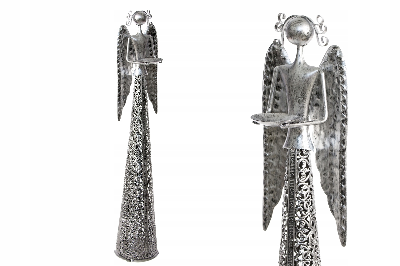 декоративний ангел з відкритим робіт з тарілкою, виготовленою з металу, намальованою методом "старого" у сріблі. Стабільна прикраса, зроблена уважно. Він ідеальний як незалежна прикраса або елемент прикраси.