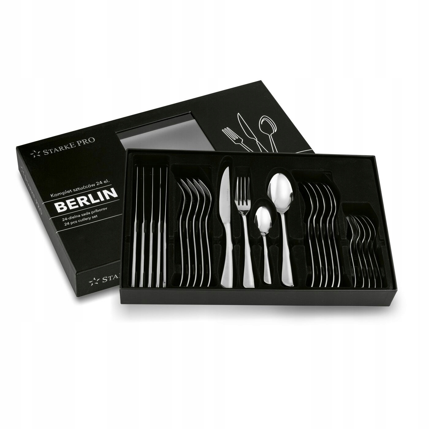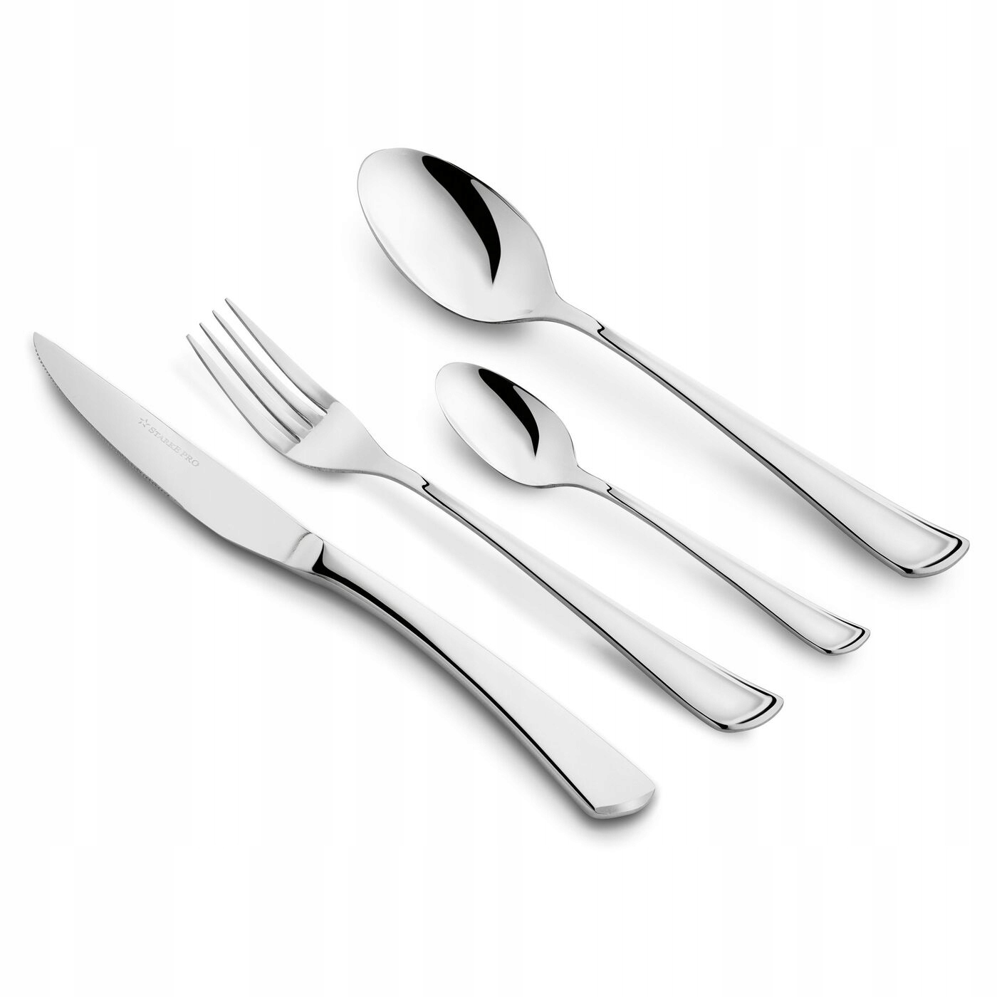 Набір столових приборів Starke Pro 24 Елементи упаковані в подарункову коробку. У ньому ви знайдете ножі, виделки, ложку та чайні ложки для шести людей. Вони дозволять вам створити унікальне розташування столу. Завдяки мінімалістичному дизайну ви адаптуєте їх до більш ніж одного посуду. Тривалість нержавіючої сталі змушує їх використовувати довгий час. Ідеально гладка поверхня полегшує піклування про їх чистоту. Ви можете використовувати їх як смачний подарунок. Упаковка з компактним сприятливим для зберігання столових приладів у ідеальному стані.
