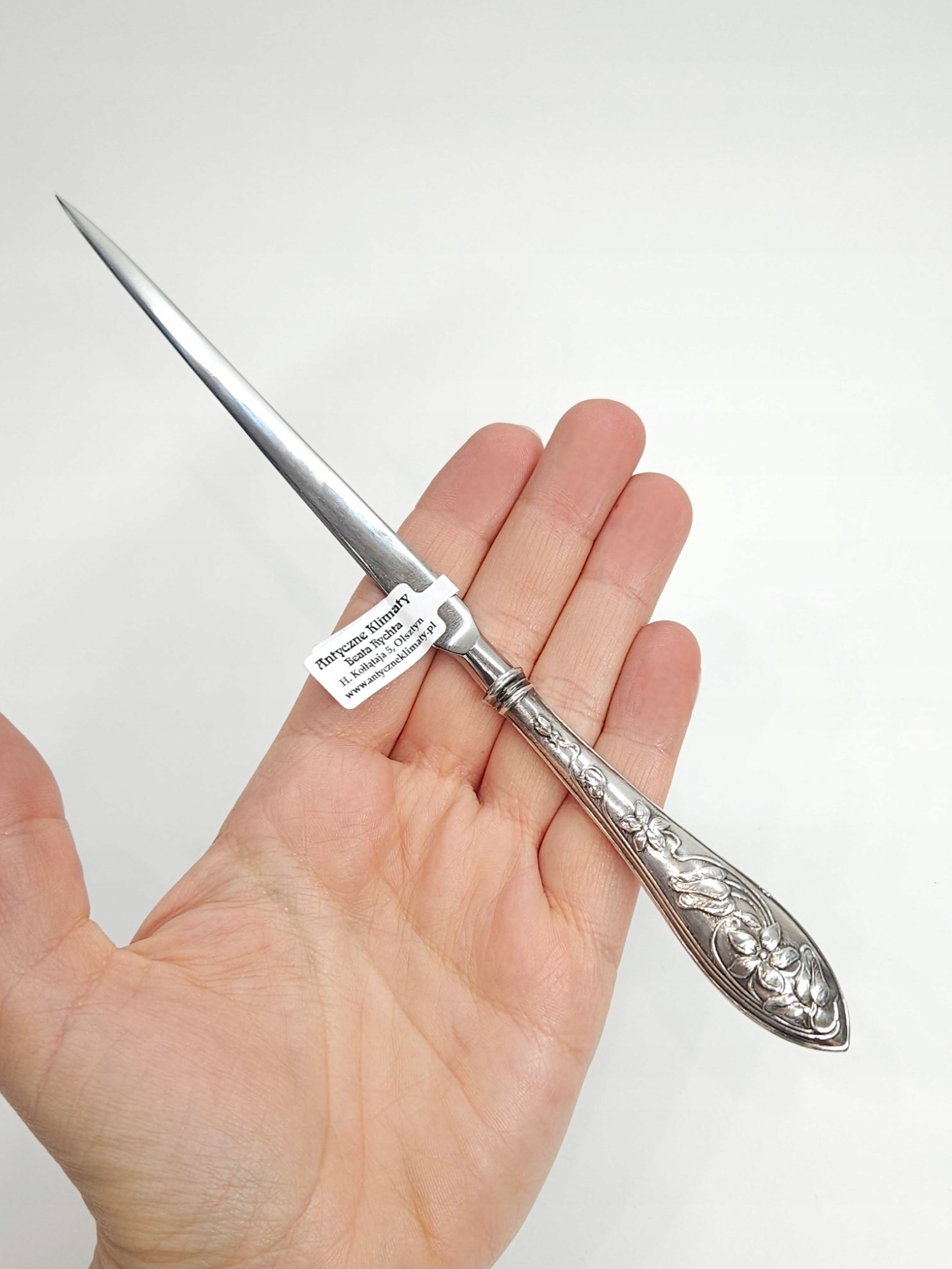 Відкривачка для листів у стилі модерн, початок 19 століття 20 століття, зі срібною ручкою, прикрашеною рослинним орнаментом, і лезом з нержавіючої сталі