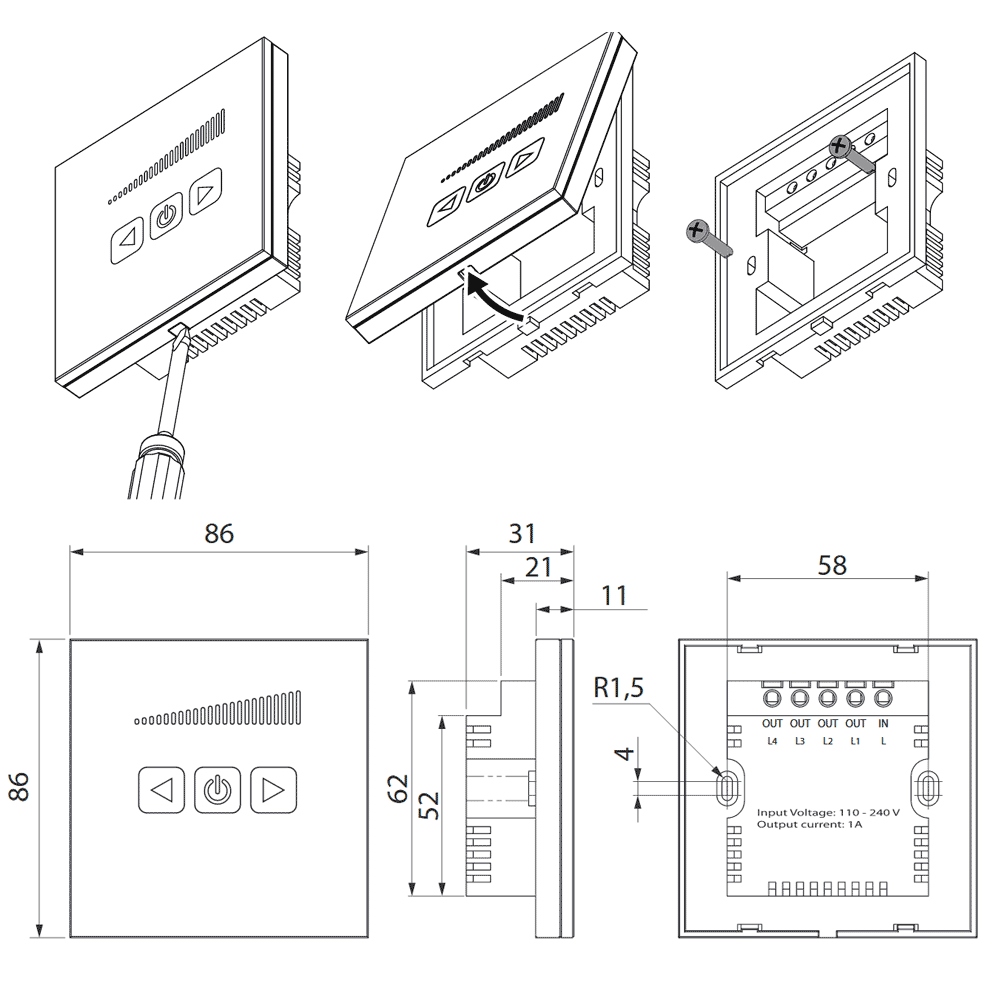 Регулятор встановлюється на стіні, всередині приміщення, в коробці прихованого монтажу, за допомогою розширювальних кронштейнів. Може монтуватися в стандартні монтажні коробки.