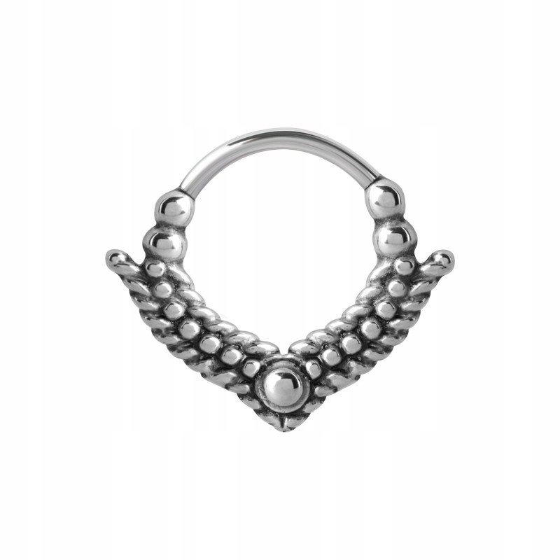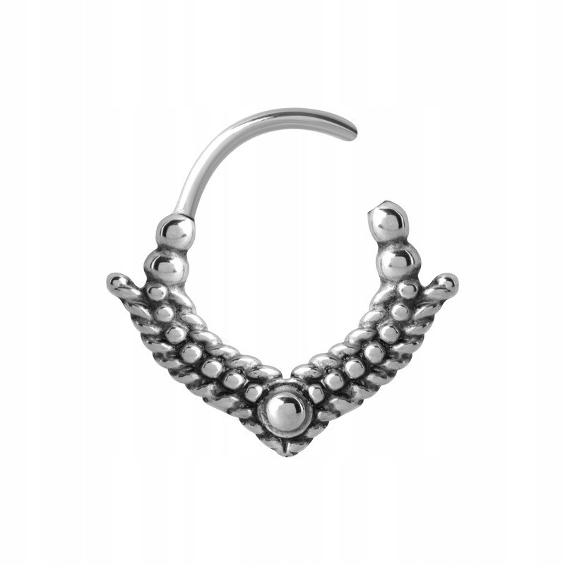 Сережка закривається фрагментом кола, закріпленим на петлі. Декорована каблучка з високоякісної хірургічної сталі 316L.
