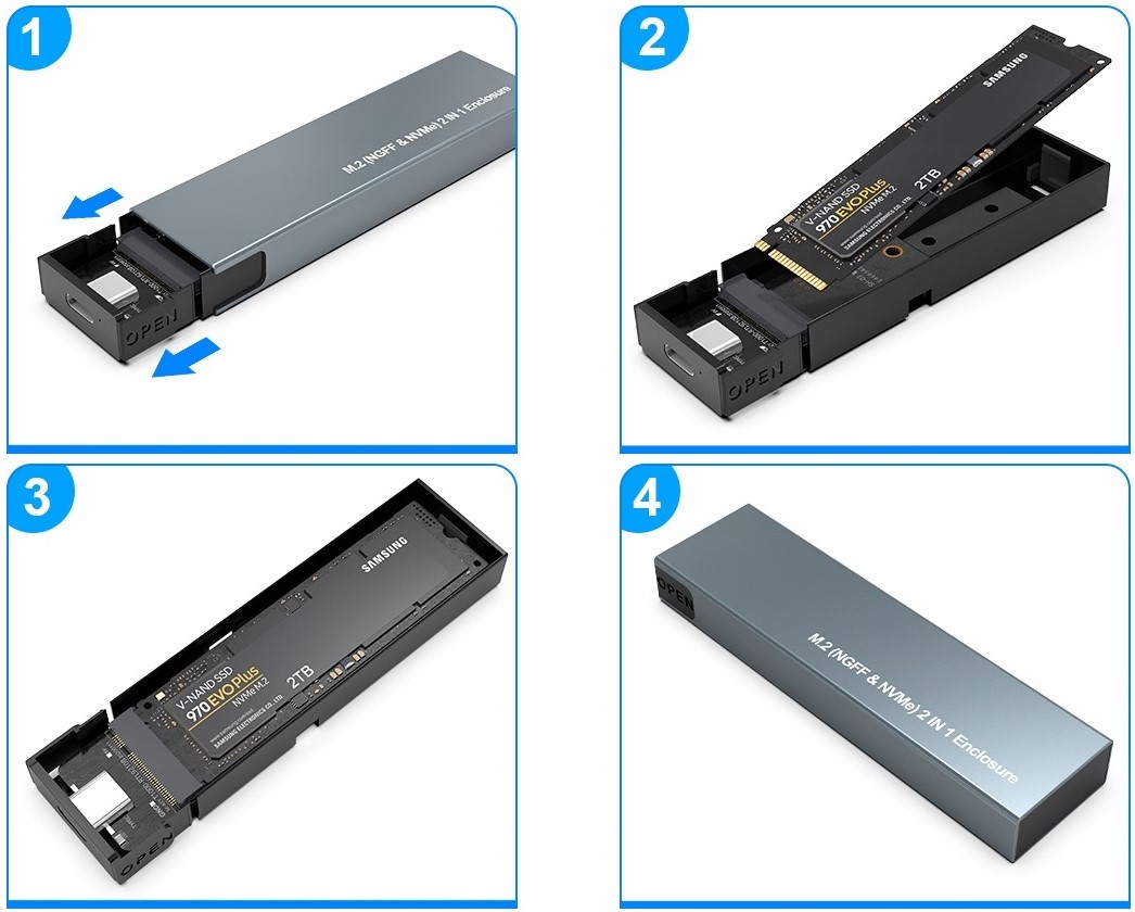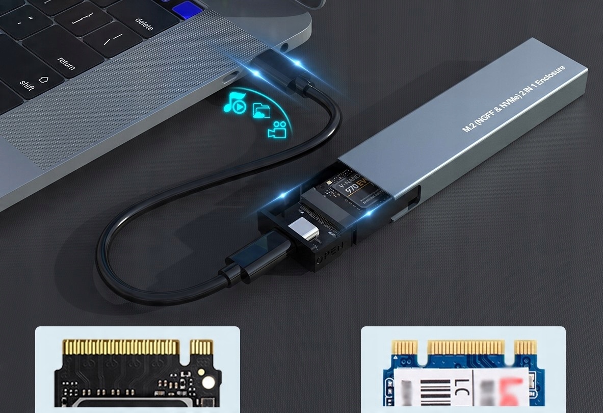 Корпус сумісний з дисками M.2 з інтерфейсом SATA та PCIe (NVMe) .